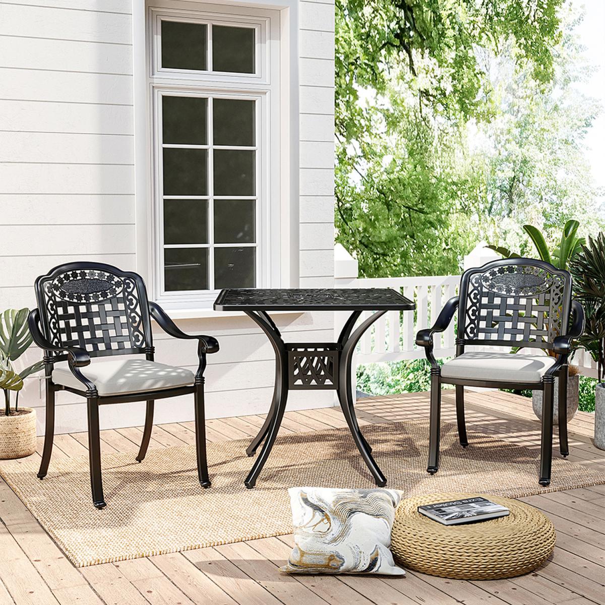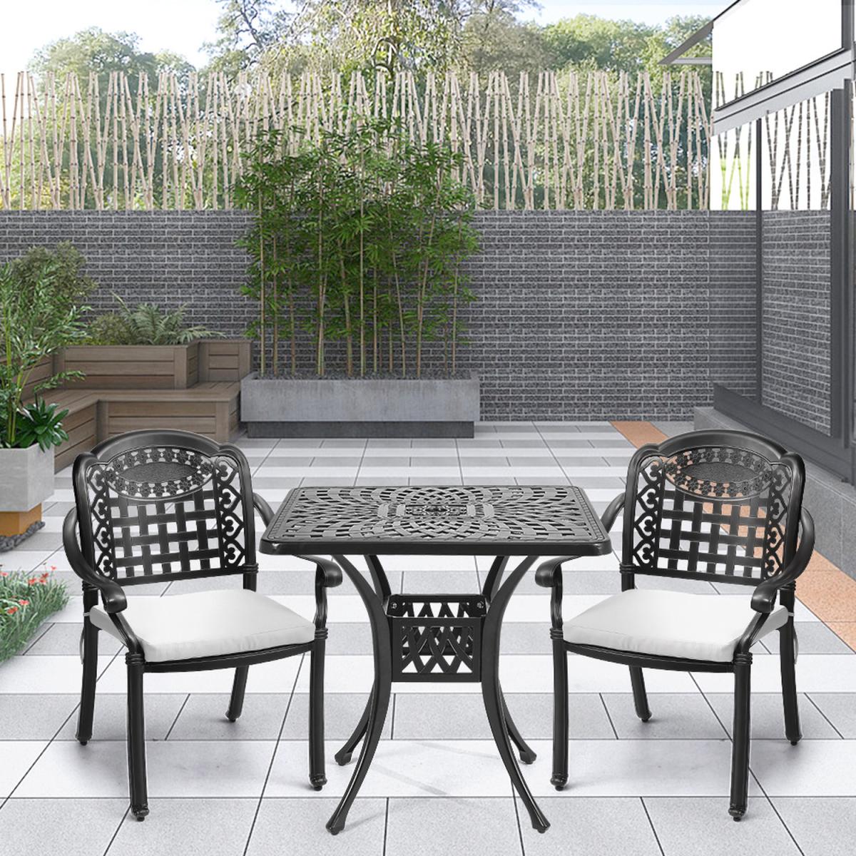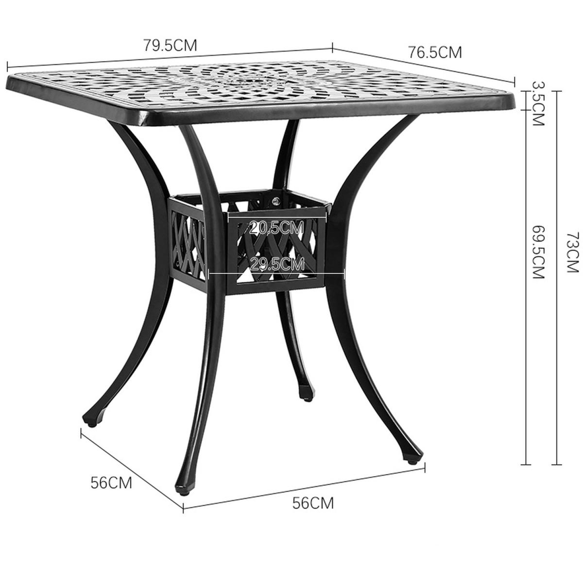 Made of premium cast aluminum, our patio table is sturdy and durable with a long service life. Exquisite craft with the powder-coated finish, resistant to rust, weather and fade, easy to clean with a wet cloth. The hollow-out design makes cleaning much easier since the water can be drained quickly, provides a maintenance free outdoor using experience, hold up in any weather condition. Add footpads at the bottom, the table can maintain perfect stability and prevent scratching the floor. There is an umbrella hole with a diameter of 2" in the middle of the table, which can be used to install a patio umbrella (not included) to protect you from the sun and rain. This patio dining table is an ideal choice for gracing your yard, poolside, balcony, garden and porch.