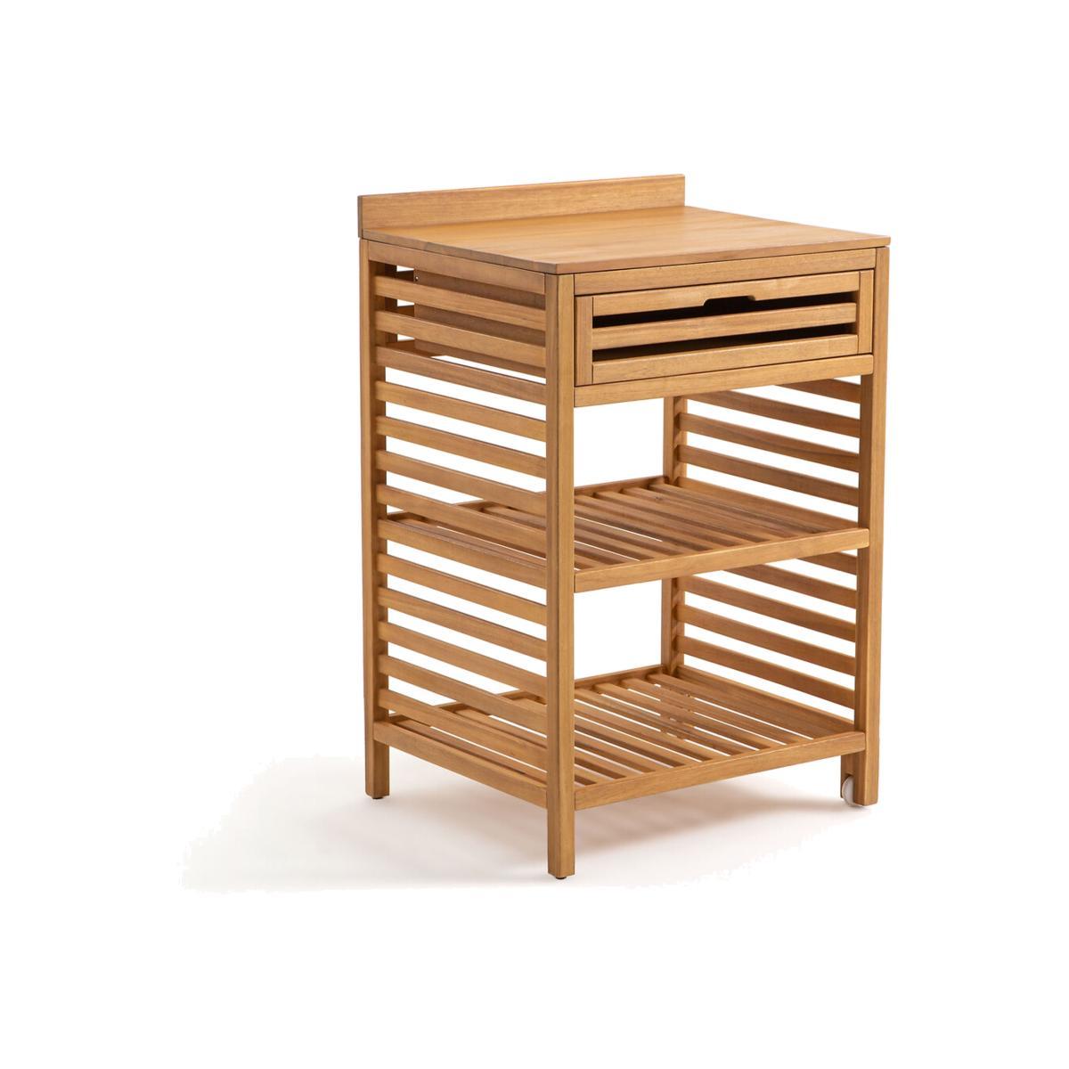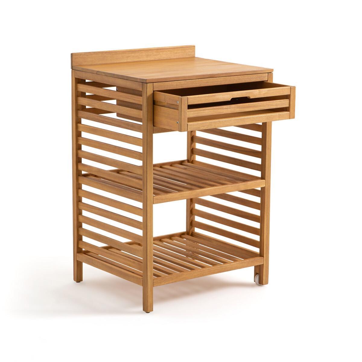 Whether you use it as a BBQ accessory or for storing gardening equipment, this acacia unit is practical and stylish! Its 2 shelves and its drawer offer excellent storage space and its wheels allow it to be easily moved around your garden. Product Details. Auxiliary furniture. Acacia structure from controlled sources with teak-tinted oiled finish. 1 drawer. 2 openwork slatted shelves. 2 small wheels for easy movement Browse the Garden collection online at LaRedoute.. Additional Information Acacia is a wood with impressive properties. It is highly durable (highly resistant to insects and fungus) and weather-resistant (withstands periods of dry and wet weather).Size. Length: 62cm. Height: 95cm. Depth: 52cm. Height between drawer and top shelf: 24.5cm. Height between the 2 shelves: 29cm Delivery:Your unit will be delivered to your door for self-assembly!Note! Please check that all access points are large enough to accommodate your delivery (doors, stairs, lifts).Dimensions and weight of parcel. L93.5 x H17 x D61 cm. 17kg.