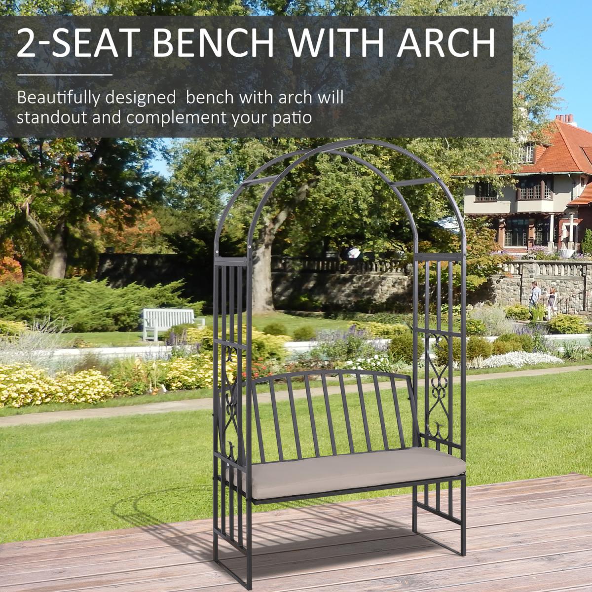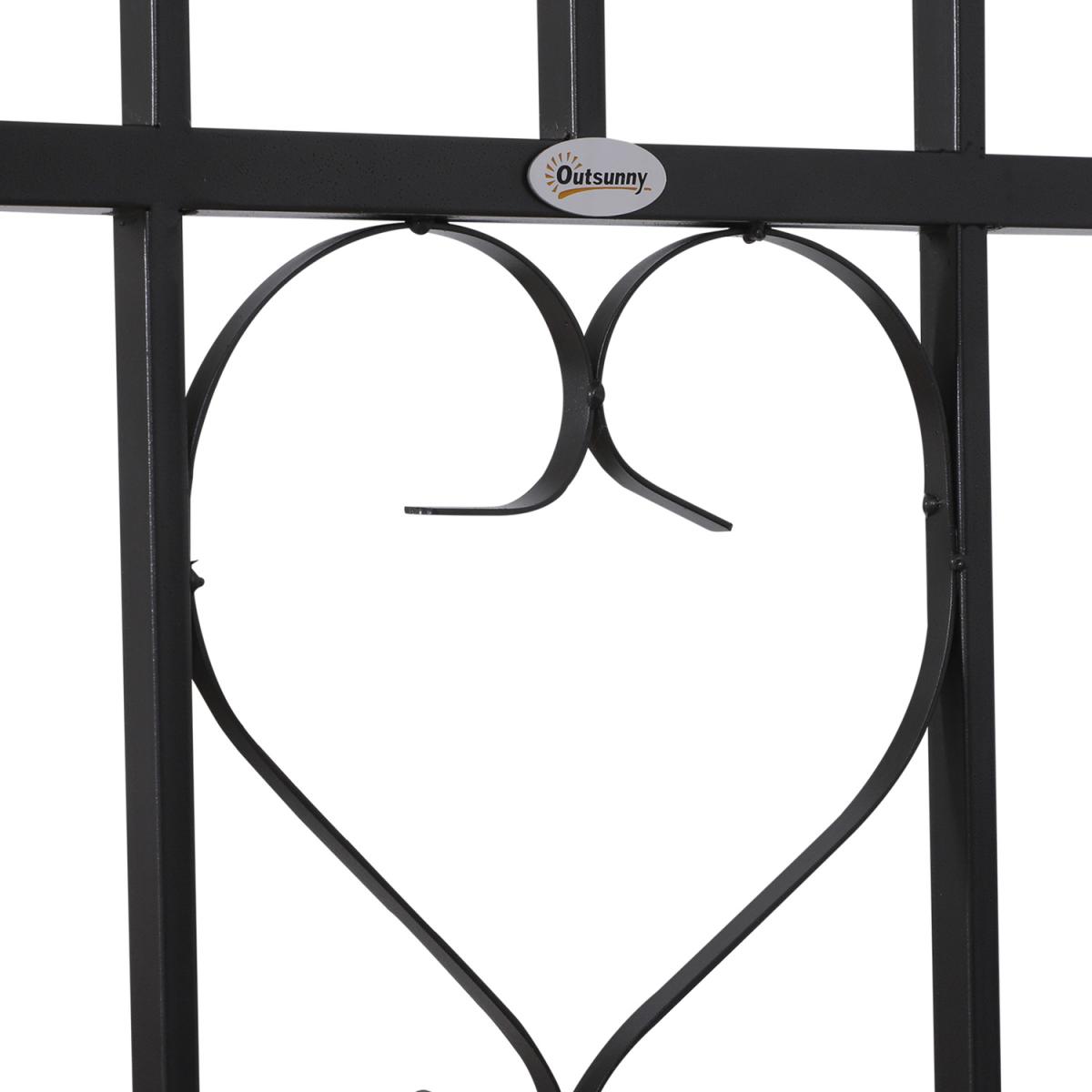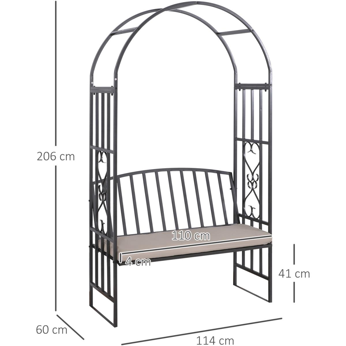 Invite a charming feel into your garden with this garden arbour bench from Outsunny. Made from metal with a black epoxy topcoat for resistance against rain, UV and other weather conditions, it is crafted into a large arch design that features delicate heart-shaped scrolling on the side, accompanied by a large seat and plush cushion that fits up to two people- ideal for resting by yourself or with a friend. Sturdy enough to support climbing plants and hanging baskets from the top, the main arch is great for creating your own unique paradise and is great as either a mainstay outdoors or a temporary addition for garden parties, weddings and more.