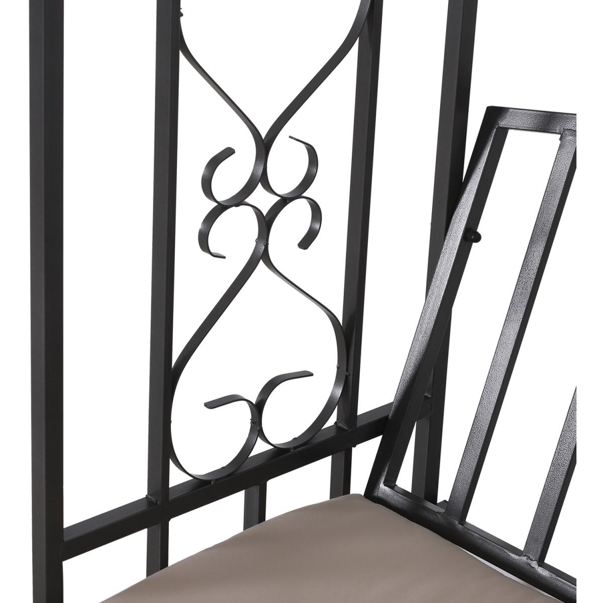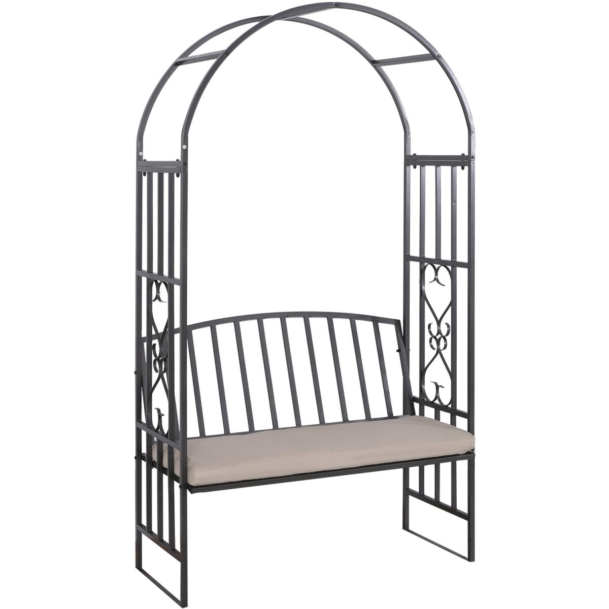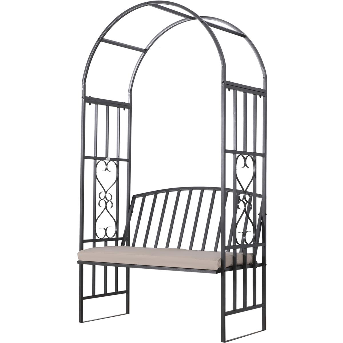 Invite a charming feel into your garden with this garden arbour bench from Outsunny. Made from metal with a black epoxy topcoat for resistance against rain, UV and other weather conditions, it is crafted into a large arch design that features delicate heart-shaped scrolling on the side, accompanied by a large seat and plush cushion that fits up to two people- ideal for resting by yourself or with a friend. Sturdy enough to support climbing plants and hanging baskets from the top, the main arch is great for creating your own unique paradise and is great as either a mainstay outdoors or a temporary addition for garden parties, weddings and more.