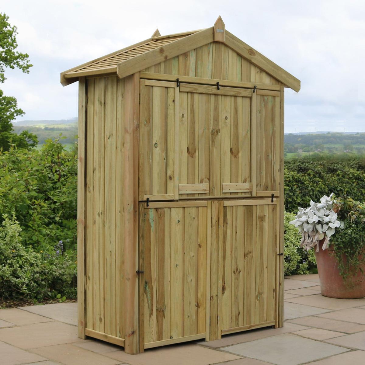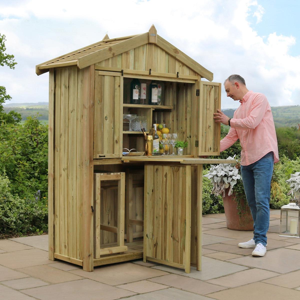 * Award winning Garden Bar and 2 stool set. * Compact yet spacious design, opening out to a full bar with storage. * Generous amount of cabinet shelving to store and display all your favorite drinks and glassware.* Further storage in the bottom section. * The stools are stackable and store inside the bar when not in use.* Neatly folds away when not in use* Weatherproof cover available as an optional extra* Made from sustainably sourced, slow grown softwood, from responsibly managed forests. * Pressure treated for longer lasting protection* 10 year guarantee against rot* Comes with an optional black protective furniture cover made from PVC backed polyester fabric.* Cover designed to perfectly fit the Zest Garden Bar and two stool set. * Protects against dirt and UV rays* Central Zip and built in cords and cord lock fastenings* Showerproof and wipe clean surface The new Garden bar, is quick and easy to set up by simply opening the two main storage doors to make a sturdy base for the fold down counter which acts as a bar. Opening the side panel hinged doors reveals fully fitted cabinet shelving ready to display a range of drinks and glasses. Guests can sit comfortably at the bar by removing the two sturdy stools which are conveniently stored inside the base section. The two stools are stackable making more room for storage. The innovative design of the compact shape opens up to make a great entertaining space. When not in use, the stools are simply stored away, the bar counter and doors neatly folded back into place and secured with fasteners. Made from sustainable slow grown soft wood from responsibly managed forests and comes with a 10 year guarantee against rot. Comes with am optional black protective cover designed specifically for the Garden Bar set. Made from PVC backed polyester fabric with a central zip and built in cords with cord locks to allow you to fully or partially close the cover around the arbour. The cover is showerproof and has a wipe clean surface.