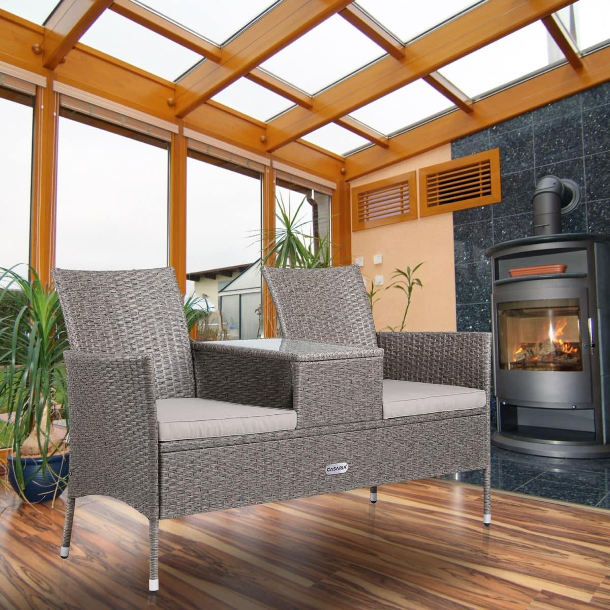 The poly rattan garden bench is a stylish addition for your outdoor area. It has a contemporary design with especially sleek hand woven poly rattan wicker. Includes strong seat pads for added comfort. A special feature is the integrated table in the middle of the bench. Put your drinks, smartphone, tablet or other utensils onto the sleek glass table top, or store it below the table top in the practical storage area. Garden Bench 2 Seater Rattan - Cream