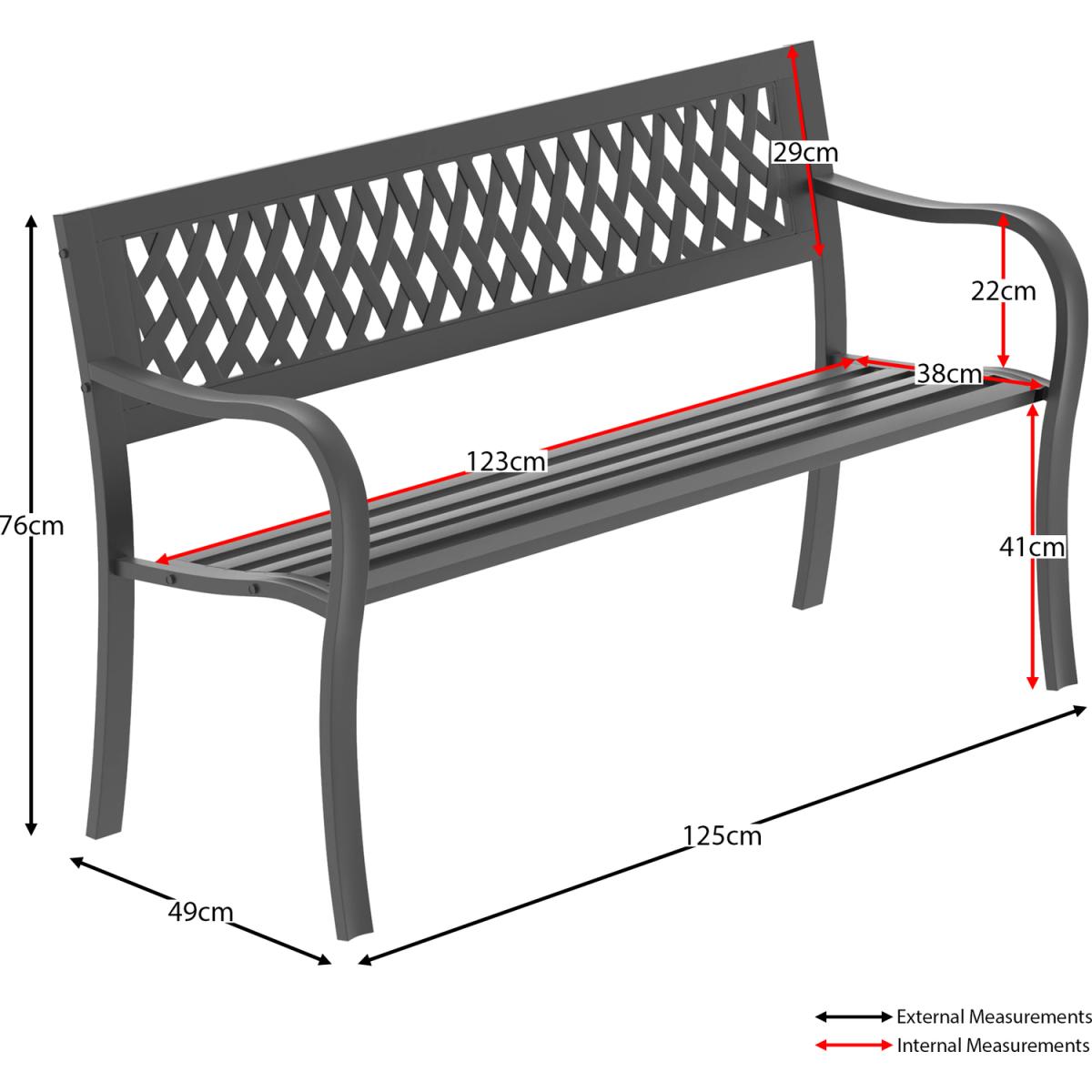 These gorgeous Steel Garden Benches are masterfully designed to comfortably seat three people. The seater bench is constructed of solid steel and has a plastic backrest with 3 distinct patterns that you can choose from. No matter where you set it in the outdoor living area, these garden benches will offer a touch of flair to any space. Additionally, this bench has sturdy steel frame legs and to ensure seating safety, the smooth and rounded edges have been meticulously constructed. Furthermore, the curved armrests and the plush backrest give the chair an additional feeling of style and relaxation. You will have the perfect location to unwind by placing this bench in your backyard or patio.