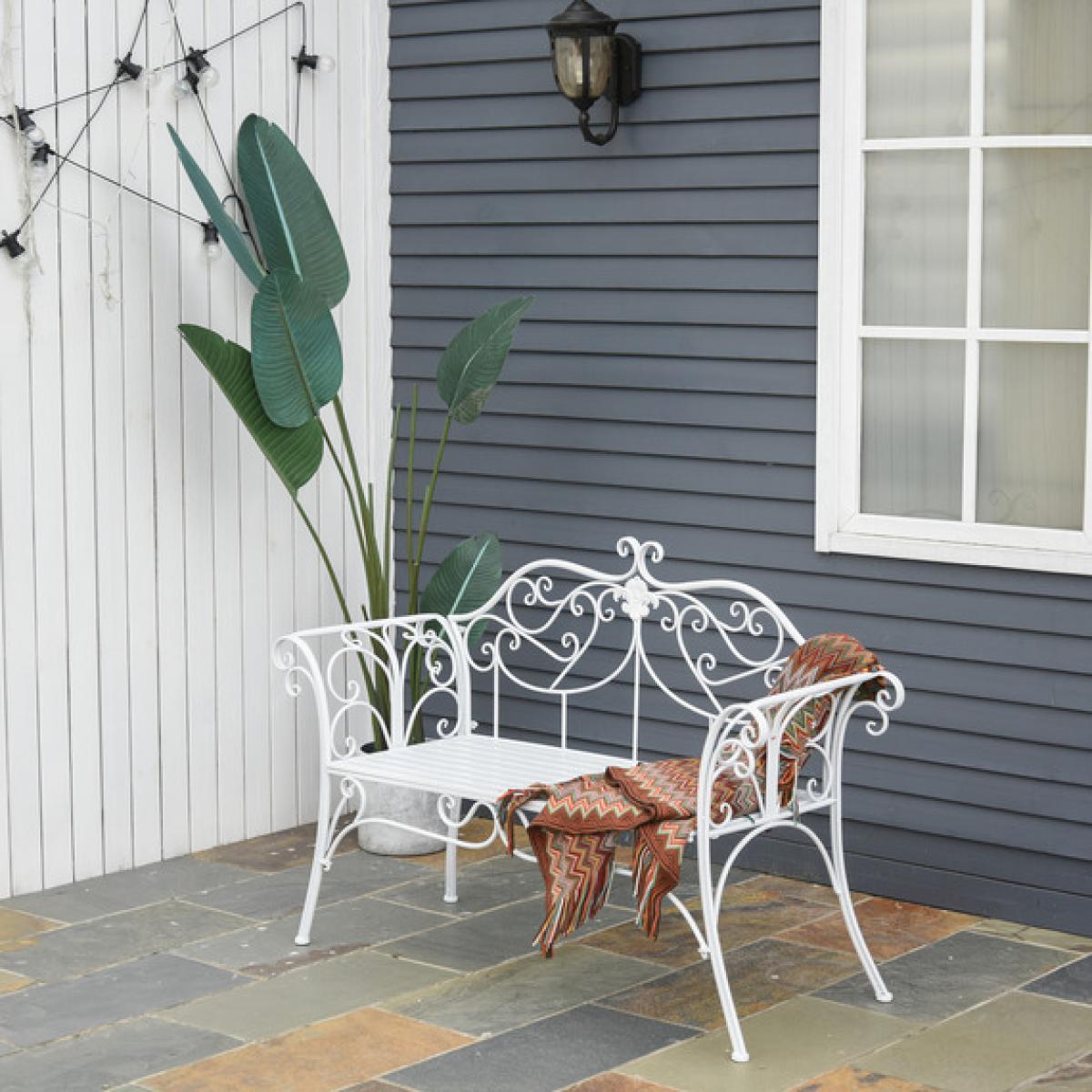 This white two-seater garden bench is a versatile piece that lends itself well to a variety of outdoor styles. I love how its classic, wrought iron design adds a timeless, elegant touch while still feeling casual. It works particularly well in traditional or cottage garden settings, but can also serve as a charming statement in a modern patio with a contrasting colour palette. For styling tips, consider pairing it with colourful cushions or a patterned throw to add comfort and visual interest. Placing it amidst lush greenery or flanking it with planters creates a cosy nook perfect for relaxing or outdoor entertaining. Its clean white finish makes it easy to coordinate with other garden furniture or decor, making it a flexible choice for many outdoor schemes.