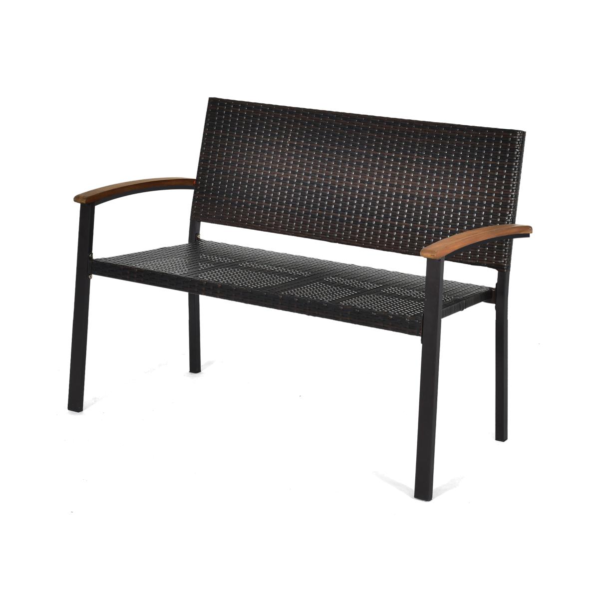Start a relaxing outdoor journey with our outdoor patio loveseat! Made of weather resistant PE rattan and powder-coated steel frame, the outdoor PE rattan bench is durable and sturdy. Moreover, the bottom sturdy structure and anti-slip foot pads bring extra stability. In addition, the high and wide back as well as the solid acacia wood armrests ensure comfort. And the outdoor patio loveseat has comfortable seating for 2 people for double fun. Furthermore, the simple outlook matches a variety of places well, such as porch, patio or indoors.
