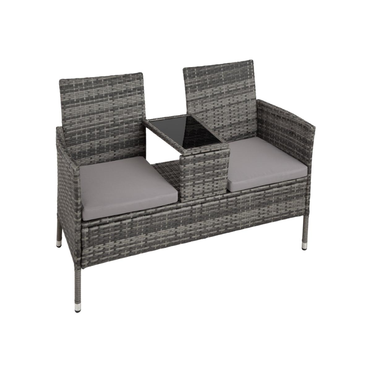 This easy-to-care-for, poly rattan garden bench from tectake with its comfortable seat cushion promises relaxing hours together with a loved one in your garden, on the patio, balcony or in the conservatory. Polyrattan is especially suitable for outdoor use and fits wonderfully into the garden scenery. The bench seat covers are removable and washable. Another highlight of this beautiful garden furniture is the integrated central table, which is situated between the two chairs, and is the perfect place for your drinks, books or sun cream. The table features a stylish glass plate top, meaning your garden bench can be used for a romantic outdoor dining experience with your partner. All in all, this 2 seater chair set is practical, stylish and durable, making it an ideal piece of outdoor furniture. Order a poly rattan garden bench from tectake for your home today.