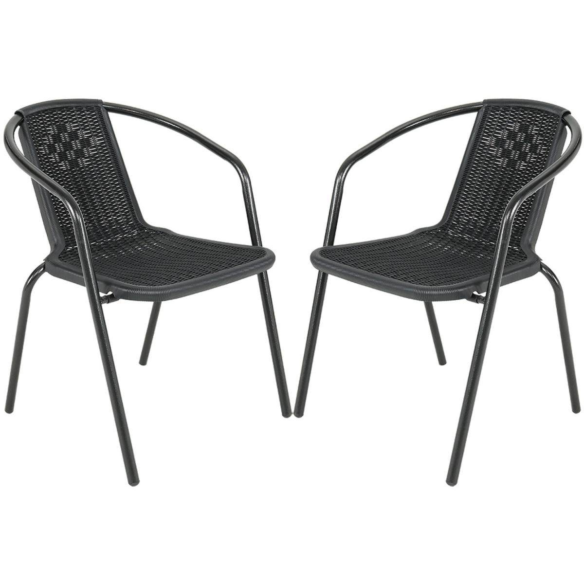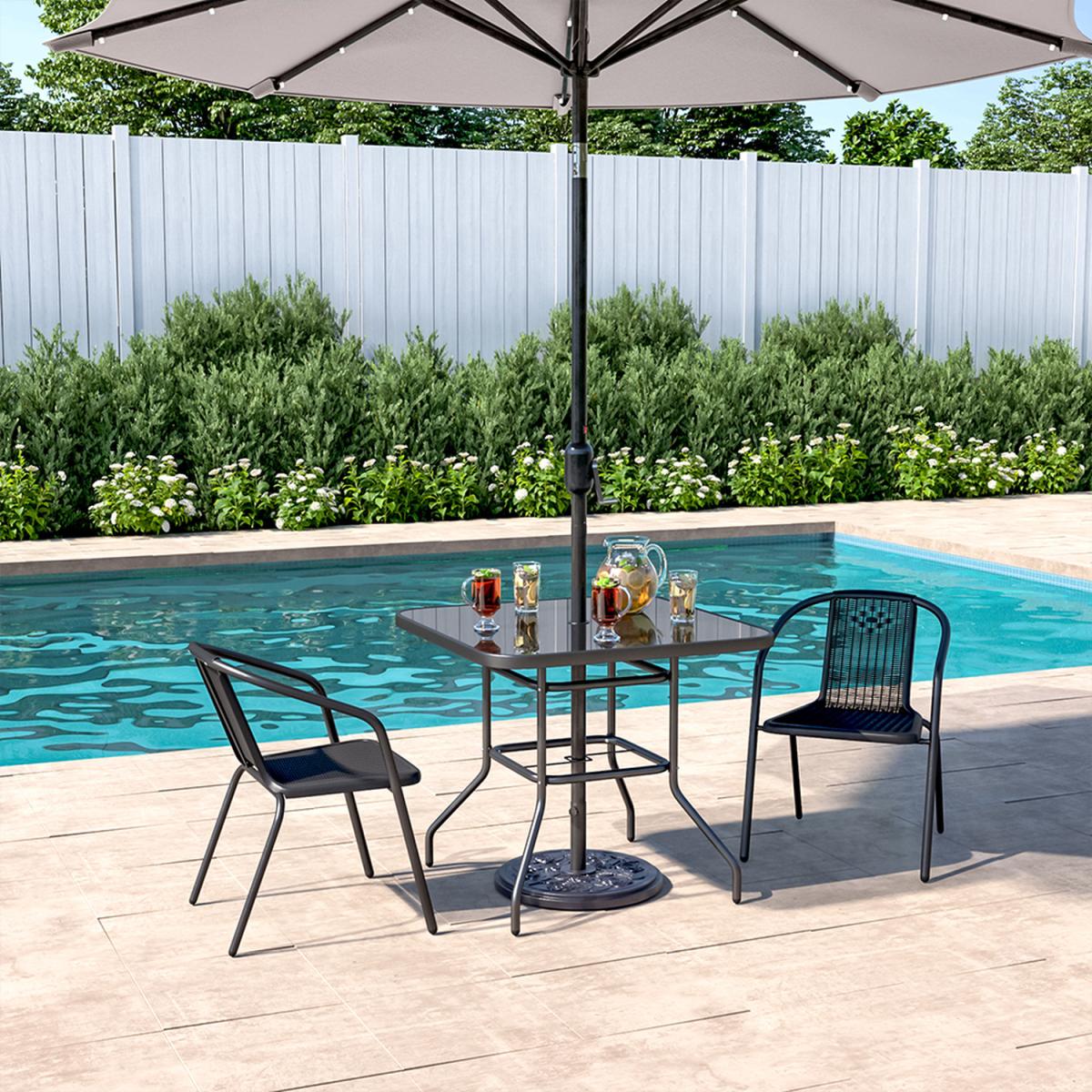 This outdoor bistro set, with its delicate appearance and high quality, can make a great experience for you. Modern and practical 3-piece patio furniture set increases a fashion style to your garden or porch. It includes a tempered table silked in black and 2 plastic stacking chairs. There's a hole in the middle of the table, where you can place a parasol to protect you from the sunlight. In a contemporary style, it's perfect to compliment your garden or balcony.