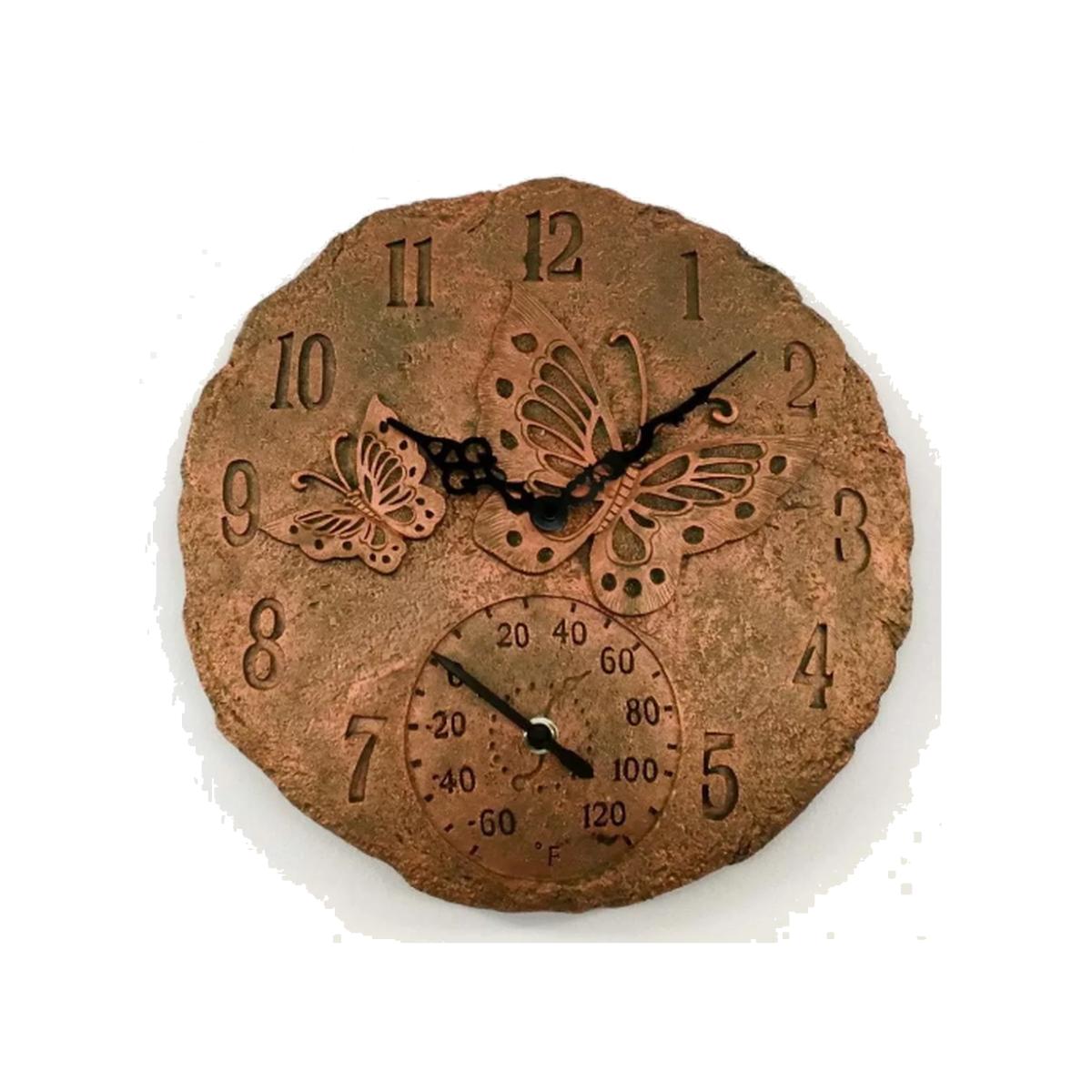 This stunning high-quality smart Clock unique slate design with 2 butterfly raised out of the slate. The large face of the clock tells the time whilst the bottom reads the temperature. This unusual Clock features an open-face design showing imitation Clock workings, has black coloured hands, a numeral display, is battery operated, and has a small thermometer included on the clock face and finished off in a bronze effect resin material