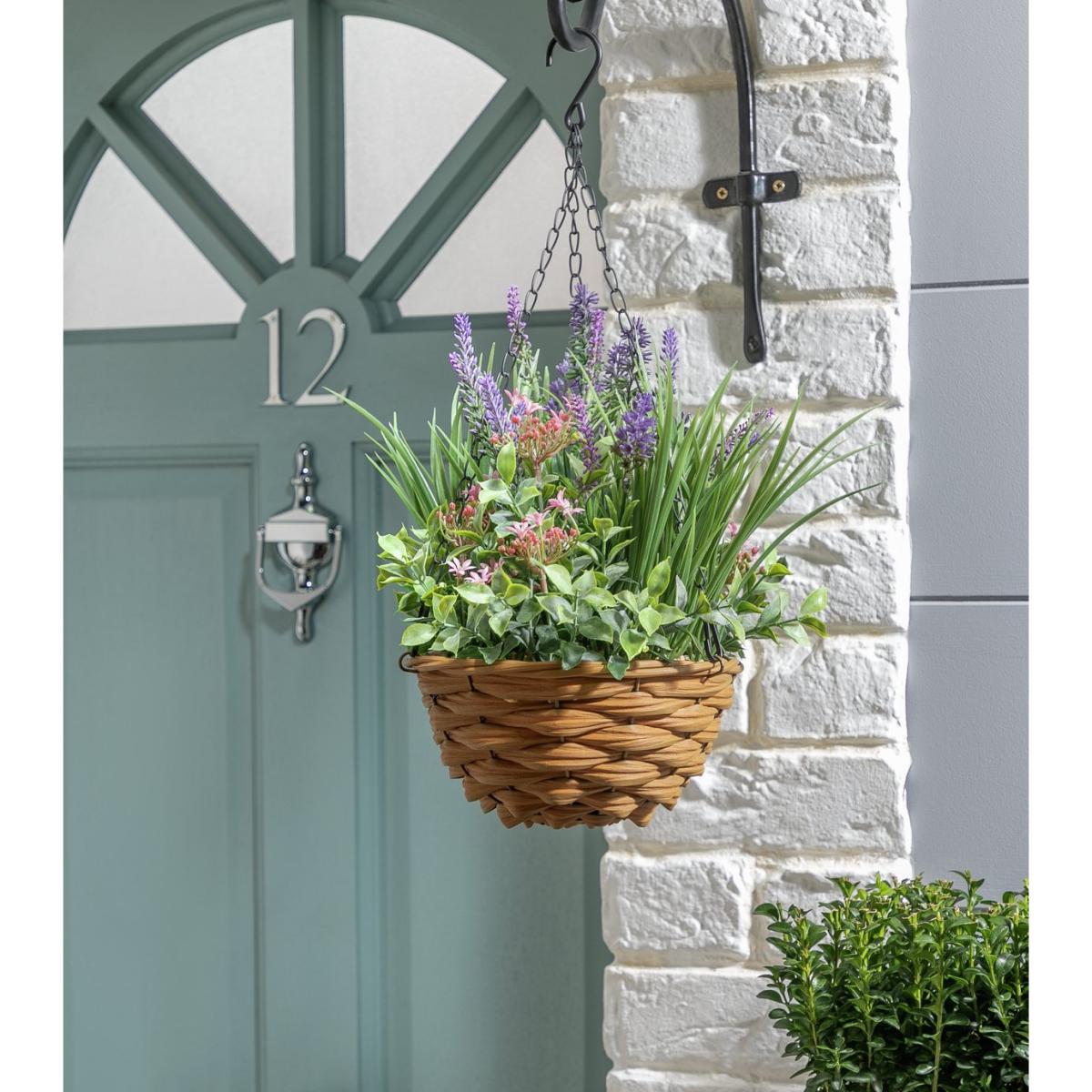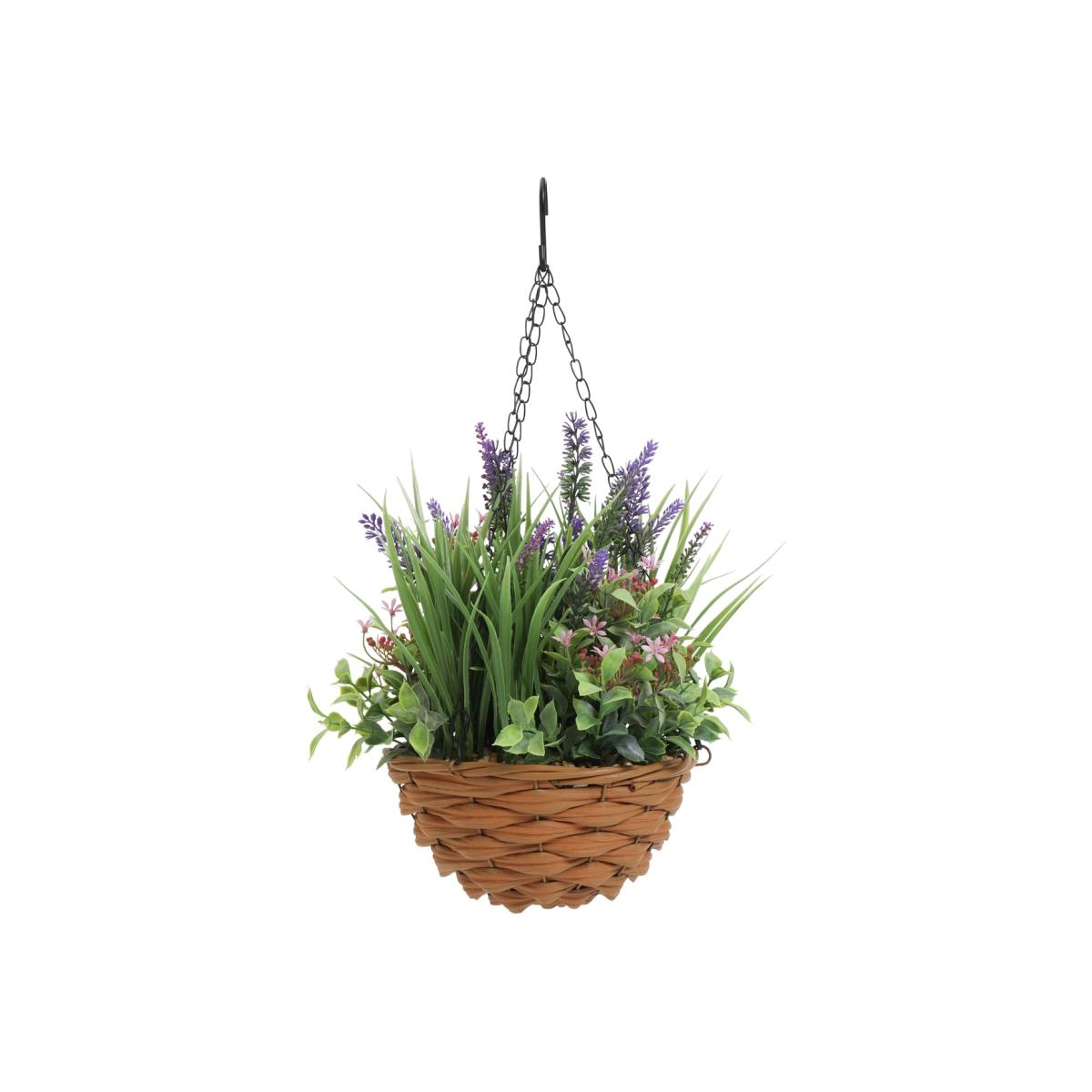 Our faux hanging wicker basket is bursting with loveliness. Super summery with pastel pinks and lilac blooms nestled amongst the seasons evergreens. Complete with chain and hook, just choose the spot, hang and wait for the compliments to flow. Why not hang a few for that lush look of beautiful outdoor botanicals. Nothing like it. Suitable for indoor and outdoor use. Plant composition: polyethylene. Pot Composition: plastic. Size H47, W30.5, D28cm. Pot size: H11.5, W20,. Pot top diameter: 20cm. The overall size may vary depending on how the item is arranged.