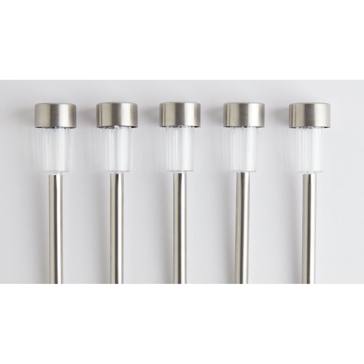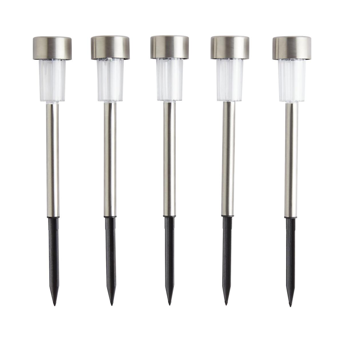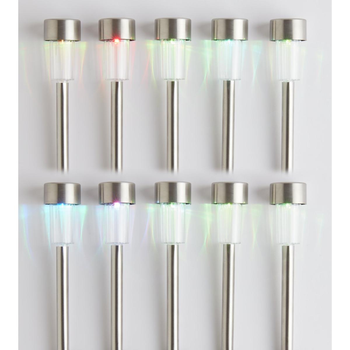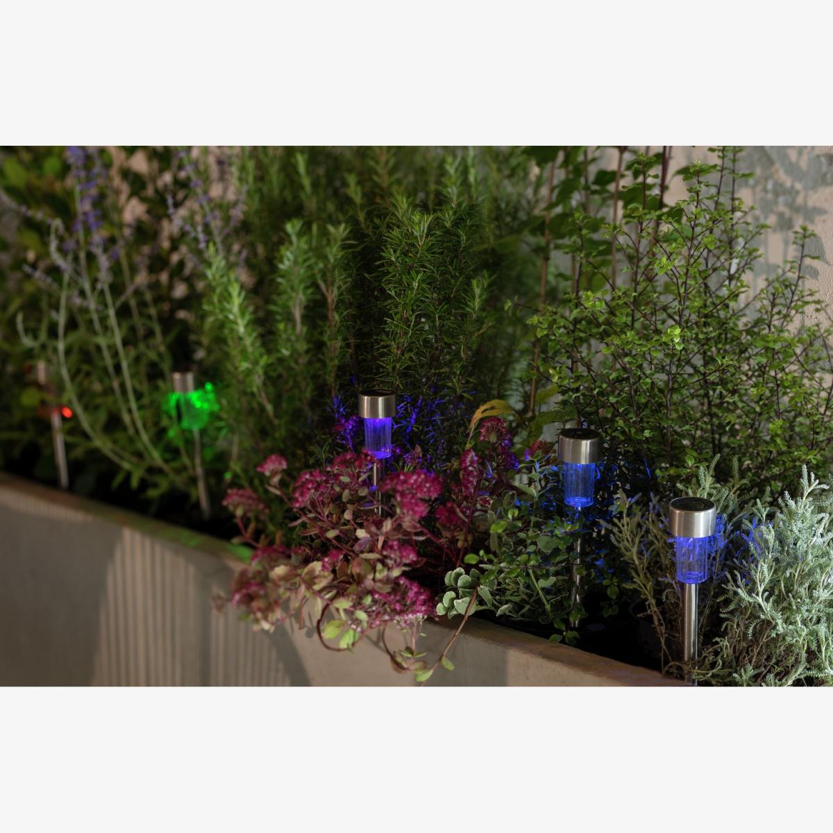 Create a solar powered lightshow on a path, driveway or in a border. You get 10 silver marker lights in a pack. And each one is fitted with a long lasting colour changing LED bulb. Stake them in the ground, wait for dusk and let the magic begin. Soft shades evolve from one pretty colour into another. Fascinating. In fact, there's never a dull moment with this lot. Solar powered. 10 lights included in the pack. On and off switch. Automatically turns on at dusk. 6 hours run time if fully charged. 8 hours of full sun light required to fully charge battery. Battery is recharged via the solar panel. Requires 10 x rechargeable battery (included). LED bulbs (included). Total size of each light: H 32.5cm, W4.7cm, D4.7cm. Multicoloured light emitted. 44 IP rating. 1 year manufacturer's guarantee.