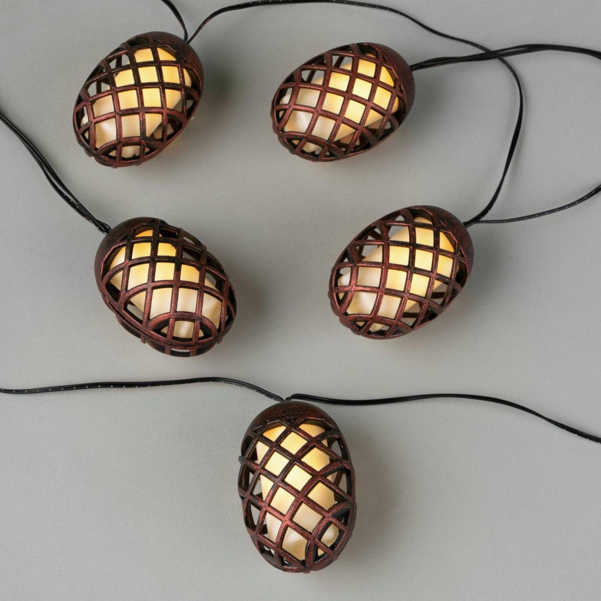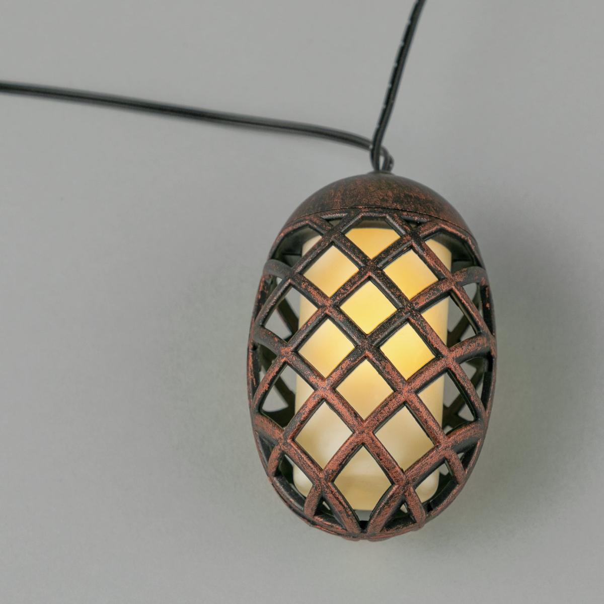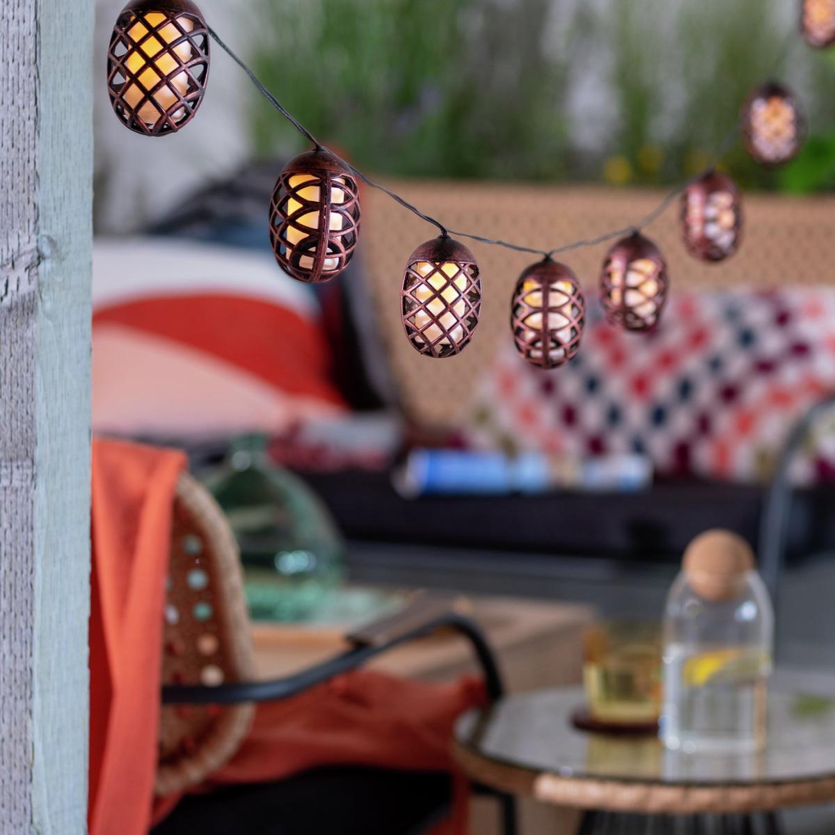 Flame String Lights 10 bronze effect toppers 2m lead, 30cm spacing between each topper Up to 6 hours of light when fully charged Batteries required: 1 x AA (included) 6 x LEDs per topper The Solar Dancing Flame String Lights are designed to create a calming dancing flame effect whilst being safe to the touch. With 10 toppers, these string lights create a peaceful and relaxing environment, whilst adding a touch of drama to your garden. They can be draped along walls, fences, trees and many other places. Solar powered. On and off switch. Automatically turns on at dusk. 6 hours run time if fully charged. 8 hours of full sun light required to fully charge battery. Battery is recharged via the solar panel. Requires 1 x rechargeable battery (included). Requires 10 x LED bulbs (included). Total length 4.7m , cable length to first bulb 2m , lit length 2.7m , bulb spacing 30cm. Light size: H 8cm , W 5.5cm , D 5.5cm. Warm white light emitted. Suitable for outdoor use. 44 IP rating. Store indoors in winter months. 1 year manufacturer's guarantee.