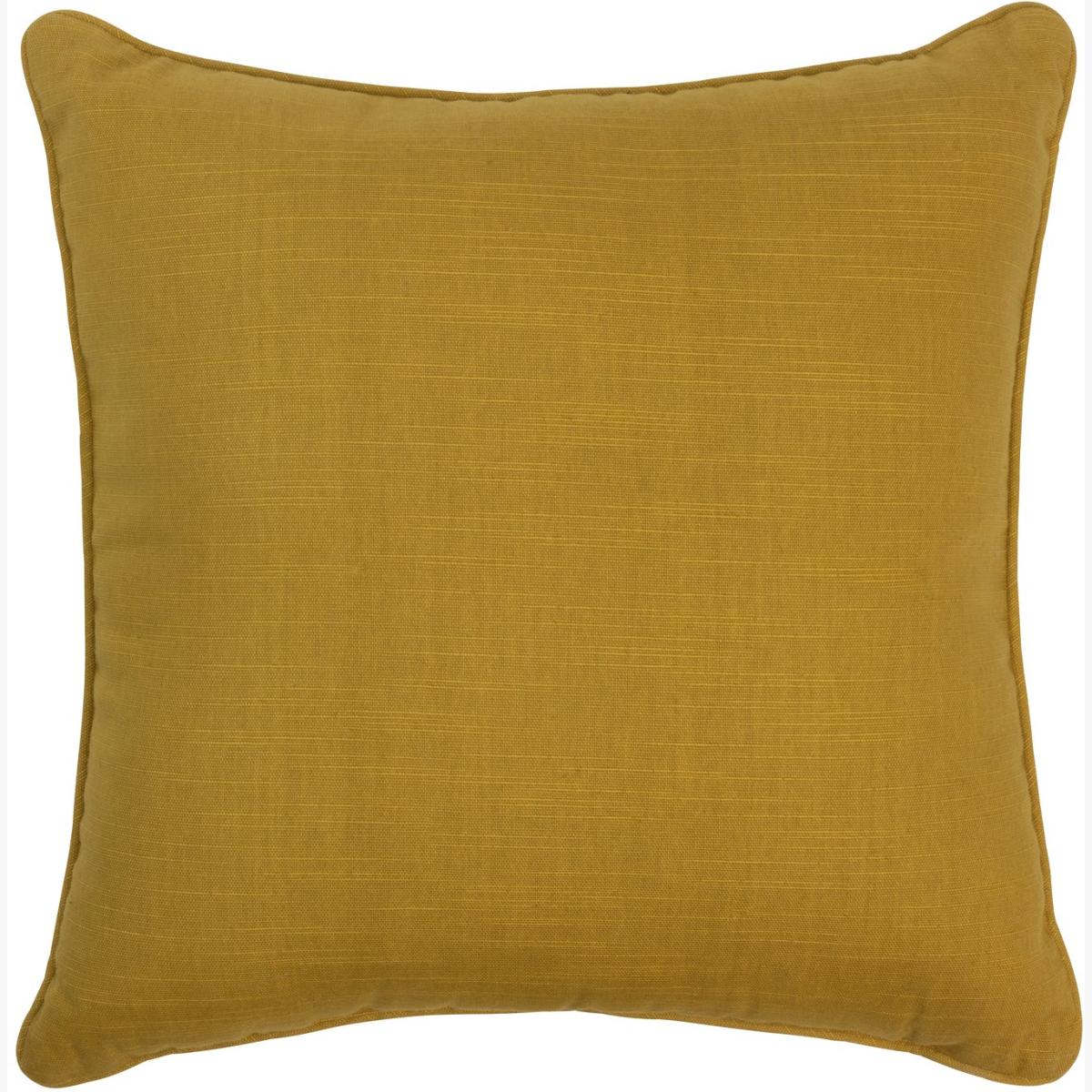 Bold, gold outdoor cushions that don't mind a drop of rain. That's a comfort. Made from pure cotton with a special water-resistant coating. This bright plump pair add a sunny softness to a lounger or chair. Each one is stuffed with recycled fabric. Good to know. Non-removable covers. Not machine washable wipe clean only. 100% Cotton. 100% Recycled polyester filling. Size L43, W43, D11cm. Water resistant. Store inside when not in use.