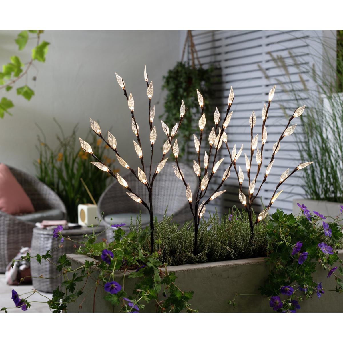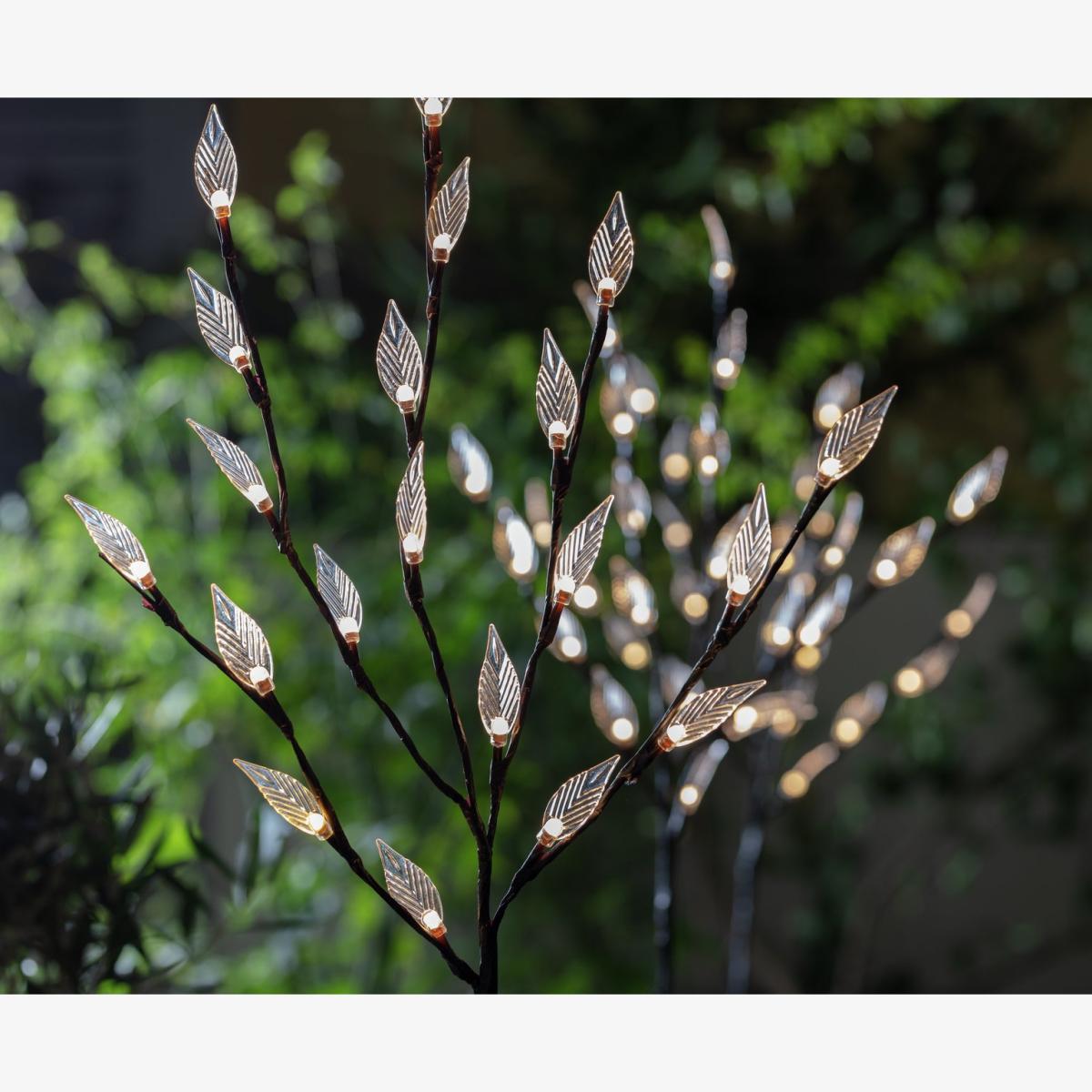As night falls enjoy the spectacle of these tree lights illuminating your garden. It's a magical and enchanting feature to add to your patio or pergola. The LED tree lights are fixed onto plastic trunks that are easy to push into the soil. Pop them together in pots or dot them around the garden. Each tree has 20 lights and they are solar powered, so they'll soak up the sun's rays during the day then send out a warm glow at night. Just sit back and enjoy the show. The three lights are powered by one solar panel. Solar powered. 1 lights included in the pack. On and off switch. Automatically turns on at dusk. Battery is recharged via the solar panel. Requires 1 x AA battery (included). Requires 60 x LED bulbs (included). Total size of each light: H 80cm, W10cm, D10cm. Warm white light emitted. 44 IP rating. 1.2 voltage. Store indoors in winter months. 1 year manufacturer's guarantee.