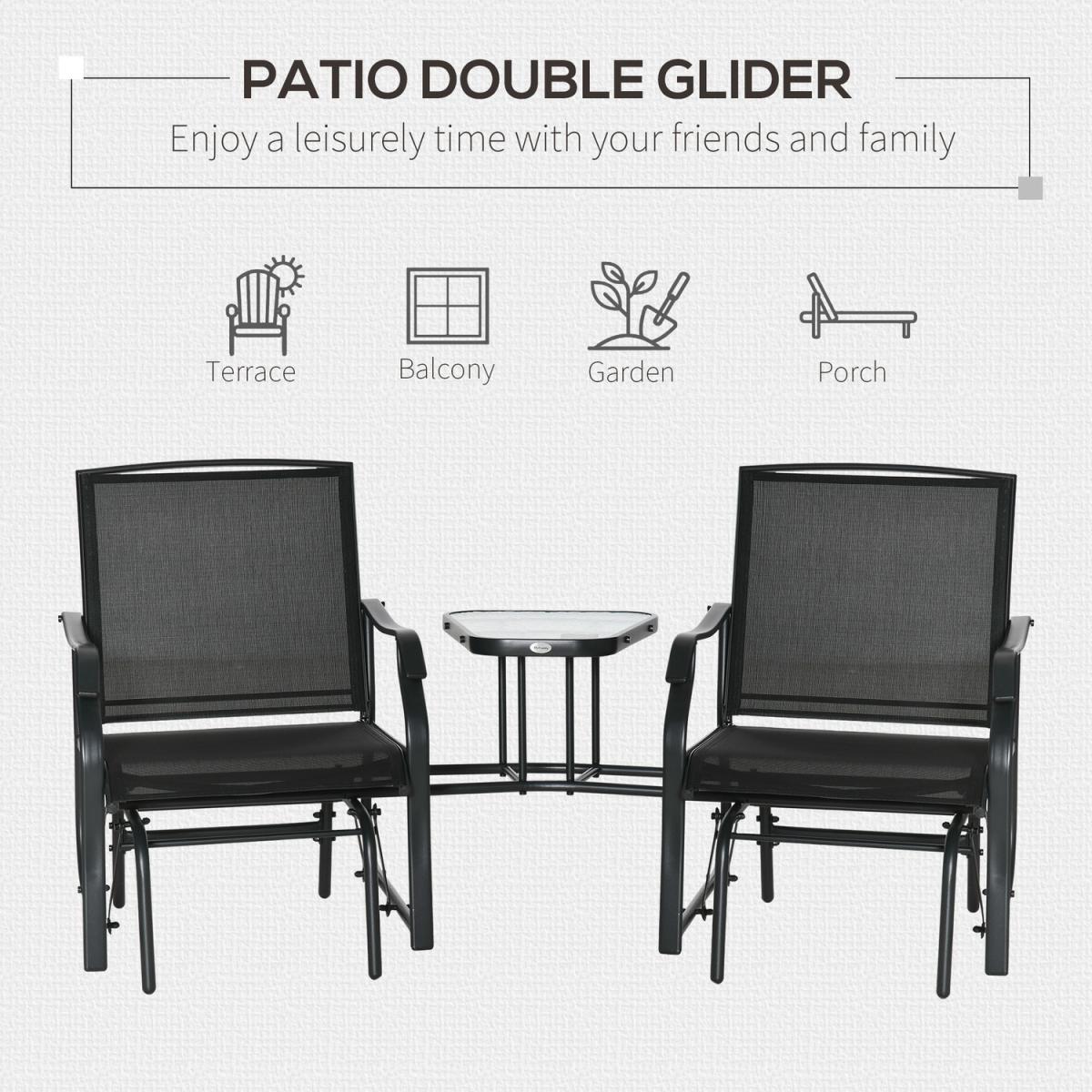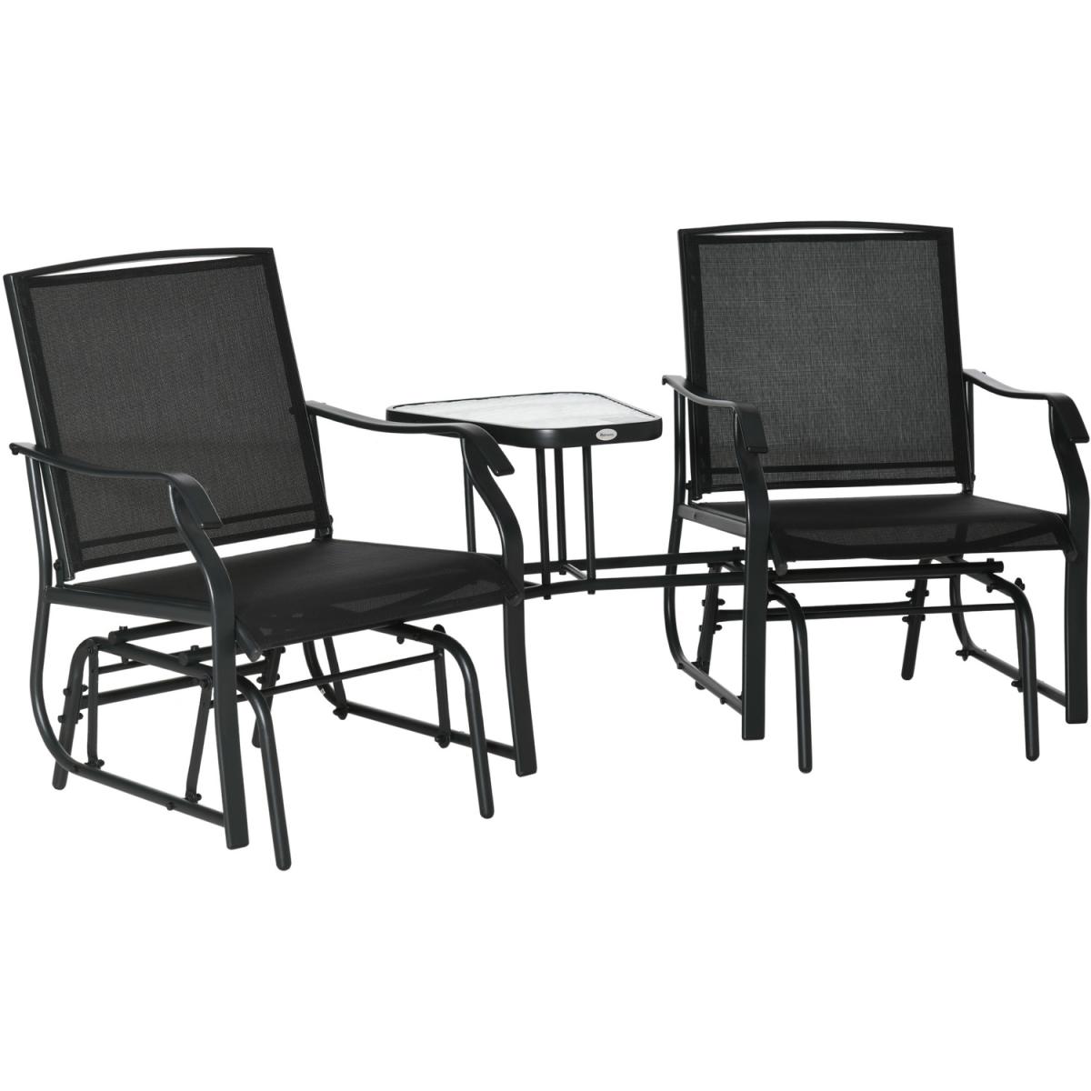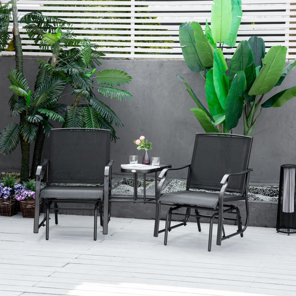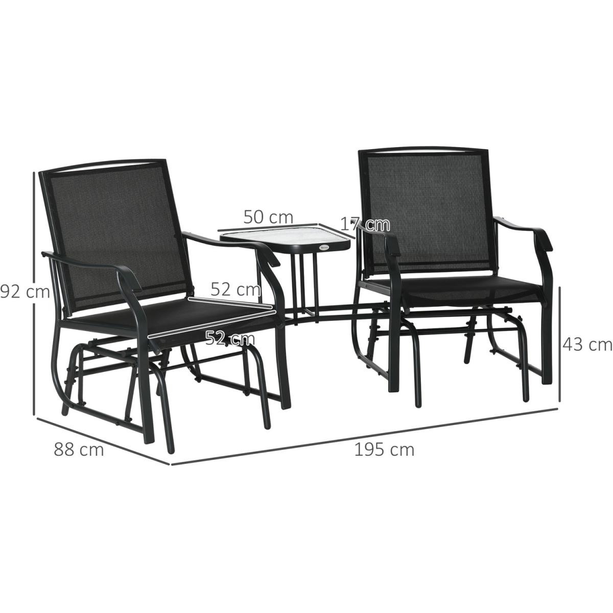 Enjoy your relaxation time with a friend thanks to this chair duo from Outsunny. Made from steel for strength and reliability, it is crafted in a smooth, individual gliding design to allow you to drift away peacefully at your own pace. Sitting on each seat is a mesh cover, keeping you comfortable and allowing your skin to breathe all day long. Made from glass, not only is the table perfect for keeping drinks, books and food conveniently close to hand, but it also is easy to clean and maintain. Whether it's for relaxing with a friend or by yourself, this seat duo is perfect for taking a well-deserved rest.