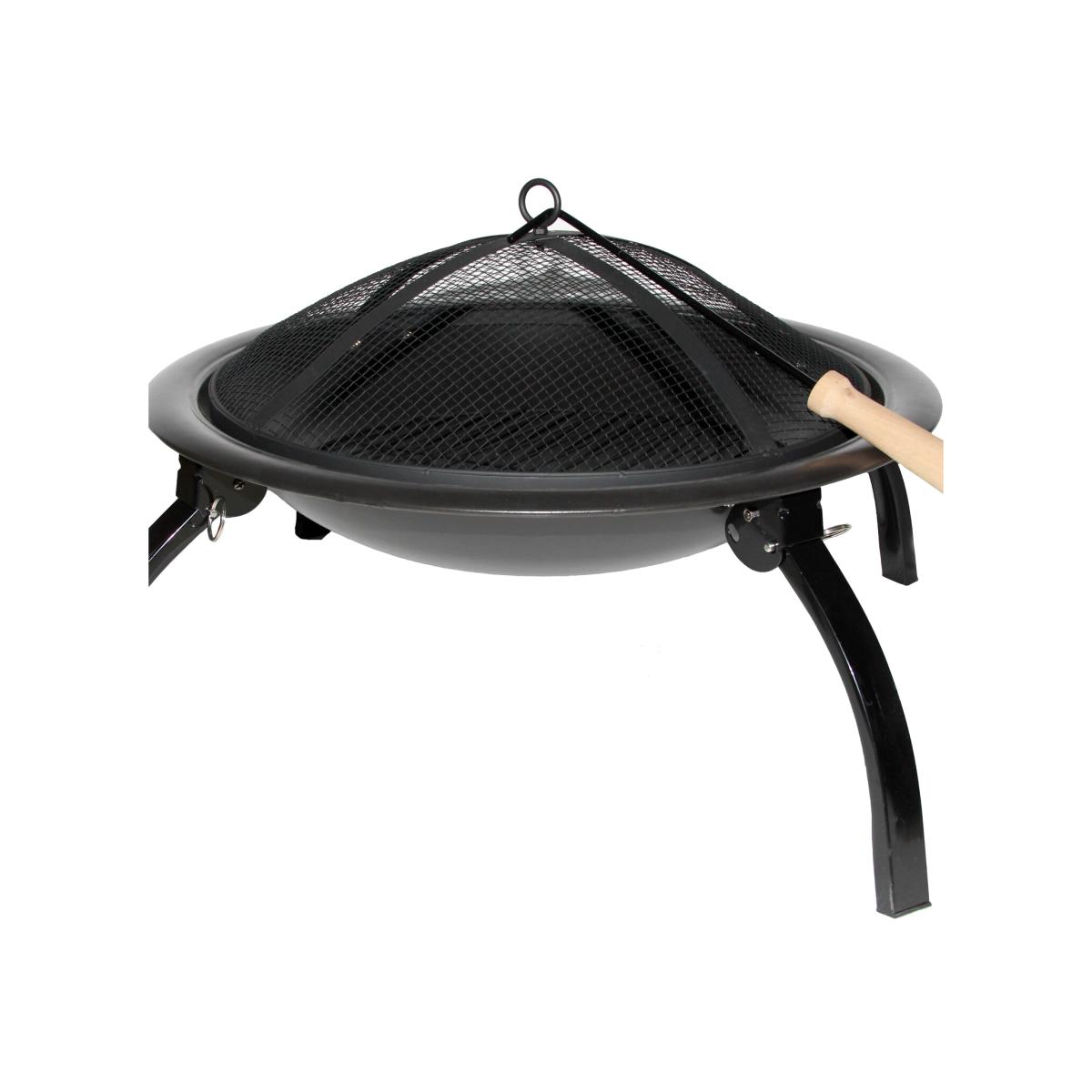 This fire pit barbecue is the ultimate choice for outdoor cooking and heating. This high quality steel fire pit barbecue allows you to enjoy the warmth and ambiance of an open fire in any backyard, patio or garden. Gather around this patio fire pit any time of the year ,from summer nights to New Year's Eve or Bonfire Night. This 56cm large fire pit comes with a spit guard and poker for maximum fire safety. The three foldable legs mean the fire pit grill is easily stored in a shed or garage when not in use, and easy to transport when camping. Made with heat resistant steel and a modern black design, this outdoor fire bowl will make a standout feature in any garden or patio setting. This fire pit barbecue is suitable for use with wood, coal and charcoal and the sturdy construction ensures safety and stability on a variety of surfaces.
