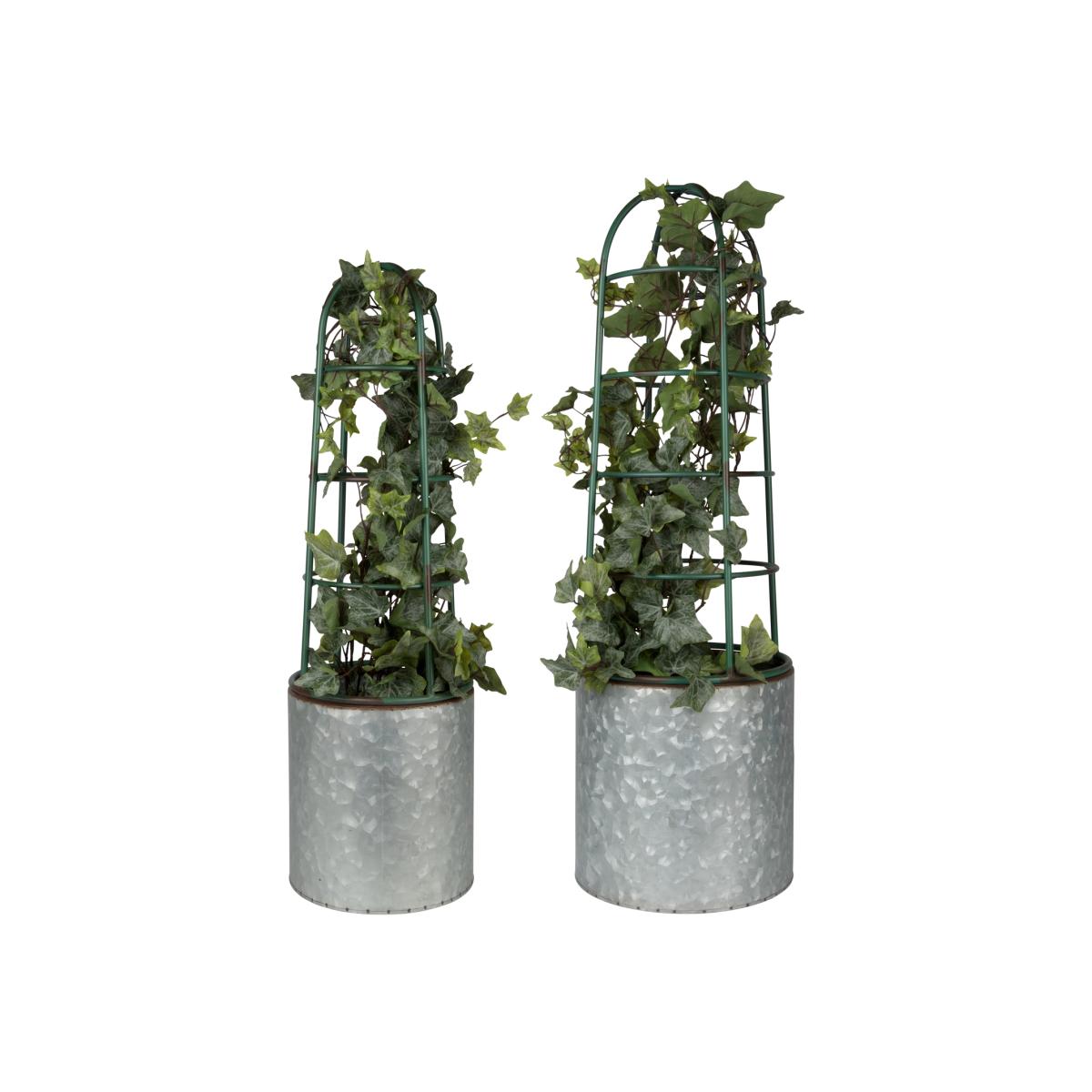 Round Zinc containers with green coated metal plant support. Comes in a set of 2 and can be used indoor or outdoor for plants.