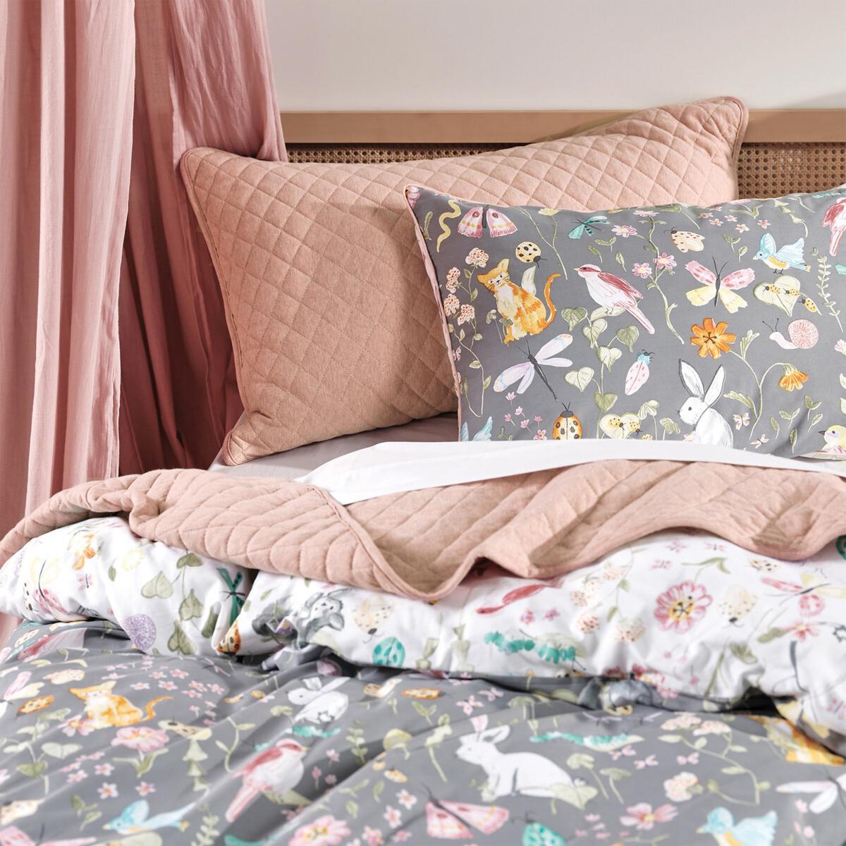 Relish garden adventures of all sorts with these sweet animal friends, big and small, floating across a lovely flower bed. Here you’ll discover delicately hand-drawn and painted delights, printed on a grey cotton percale ground. Trimmed with blush cord piping, Garden Friends can also be flipped for a brighter aesthetic. Composition: 100% Cotton. This product will be dispatched by one of our trusted suppliers. You’ll be contacted by their selected courier about your delivery.
