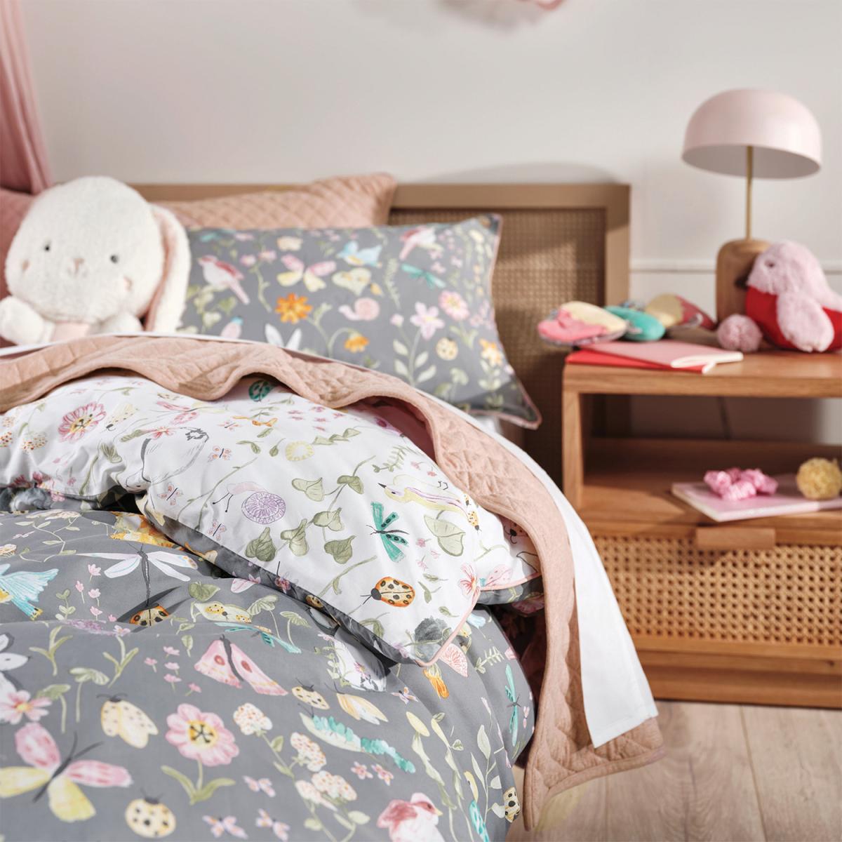 Relish garden adventures of all sorts with these sweet animal friends, big and small, floating across a lovely flower bed. Here you will discover delicately hand-drawn and painted delights, printed on a grey cotton percale ground. Trimmed with blush cord piping, Garden Fun can also be flipped for a brighter aesthetic.