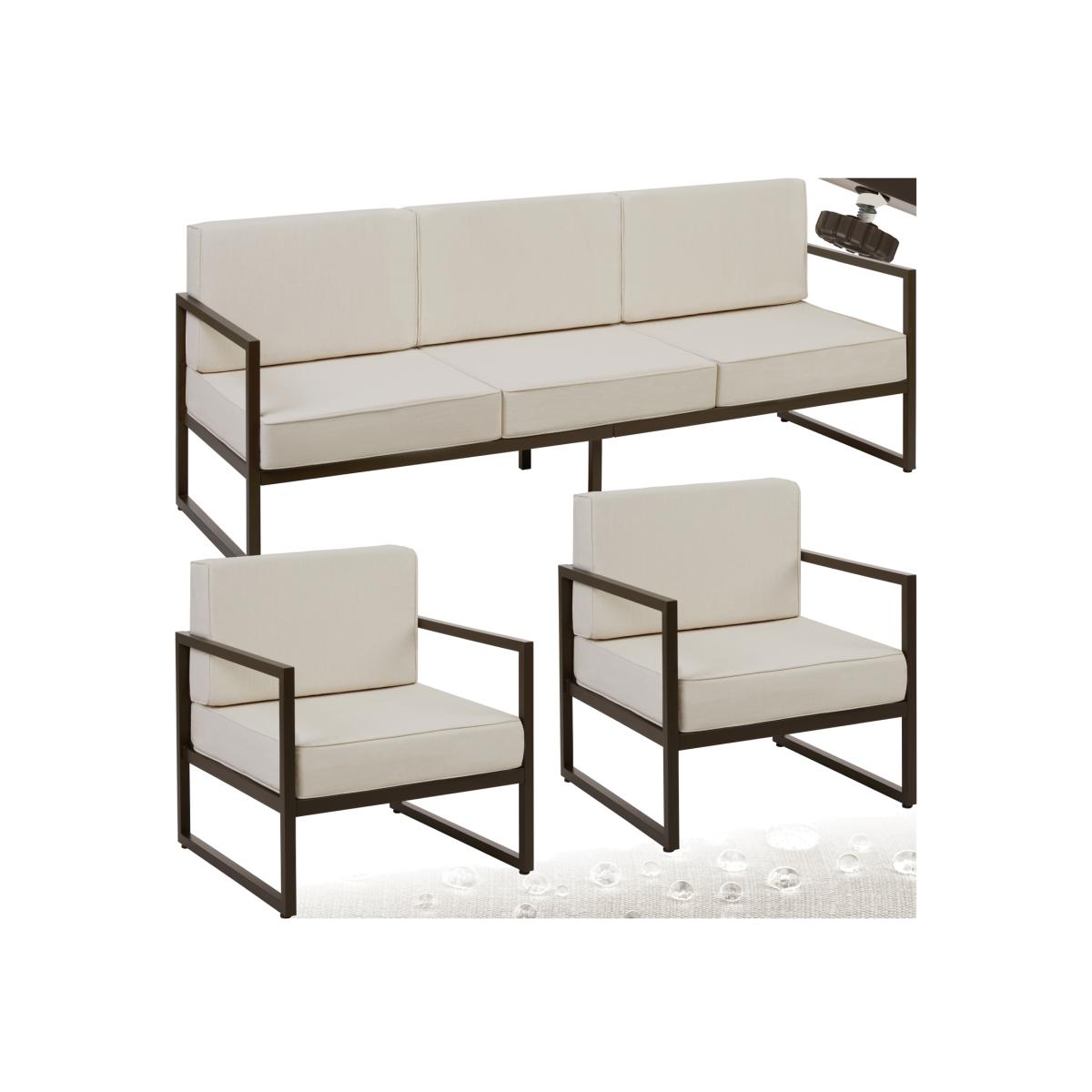 pTransform your outdoor space into a cozy and inviting retreat with the Comosa garden lounge set from tectake. This stylish set includes a 3-seater sofa and two comfortable armchairs, providing plenty of seating for up to five peopleperfect for relaxing with family and friends during those warm summer evenings. Whether placed on your terrace, balcony, or in your garden, it creates a welcoming atmosphere for all to enjoy. The extra-thick cushions offer exceptional comfort, encouraging you to lean back and unwind. Plus, the water-repellent and easy-care cushion covers are removable with a zip, making cleaning a breeze. With its rattan design and grey cushions, this set adds a modern yet timeless touch to any home or outdoor setting.p p. The robust steel frames provide outstanding stability and load-bearing capacity, while the powder coating offers excellent protection against the elements. The height-adjustable, floor-friendly feet ensure the set remains stable on any surface, making it perfect for use on your patio, terrace, or in your garden. Whether you're looking for the ideal dining set or a comfy corner lounge, these garden sofas and chairs will have you covered. With new designs at an unbeatable price and fast delivery, its the perfect addition to your outdoor furniture collection, helping you create the perfect oasis of comfort and style.p