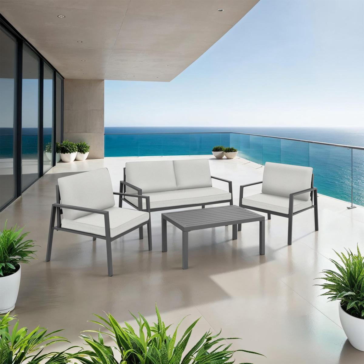 pThis stylish garden furniture set from tectake, featuring subtle grey tones, brings both comfort and elegance to your outdoor space. The four-piece set includes comfortable chairs with thick, spongy cushions, perfect for lounging. The durable, rust-proof aluminium frame and water-repellent accessories ensure that the set is built to withstand outdoor conditions. The sleek, simple design of the table complements the chairs, making it an ideal choice for relaxed dining and outdoor gatherings.p p Easy to assemble and maintain, the 4 seater set is flat-packed for convenience and can be quickly put together. The two seater sofa is perfect for a patio and the two metal chairs can easily fit into a corner. This grey garden furniture is the perfect alternative to a rattan set.p p. The cushions are dirt-repellent and can be cleaned effortlessly with a damp cloth, ensuring long-lasting comfort and style. Elevate your outdoor lifestyle with this chic, functional garden seating set from tectake, and enjoy the perfect balance of form and function.p