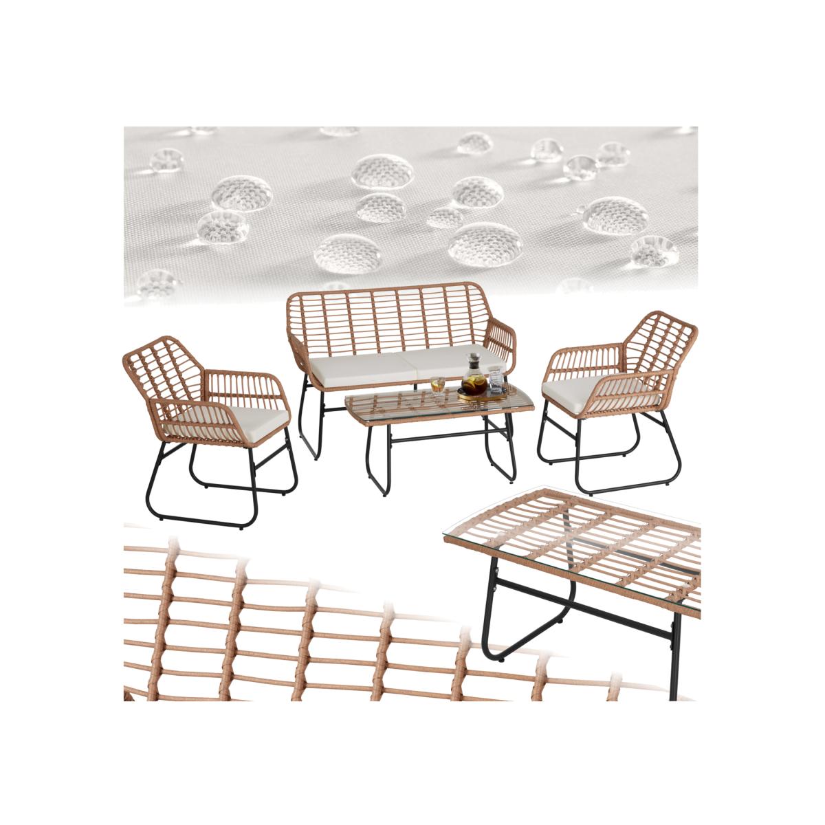 pEnjoy ultimate comfort with the Molfetta XL Rattan Seating Set from tectake. This spacious set comfortably seats up to four people, making it perfect for your garden, balcony, or terrace. The finely woven rattan and metal frame ensure both durability and stability, while the height-adjustable feet provide a secure stand on any surface. These four seater sets with a sofa, table and two chairs easily fit into the corner of any patio.p p. Molfetta XL Rattan Seating Set Stylish Outdoor Furniture for Your Garden. Complete with comfortable cushions and removable covers, this outdoor furniture set offers easy maintenance. Ideal for relaxing, chatting, or enjoying drinks, the Molfetta XL set creates a stylish space for your dining or leisure needs.p