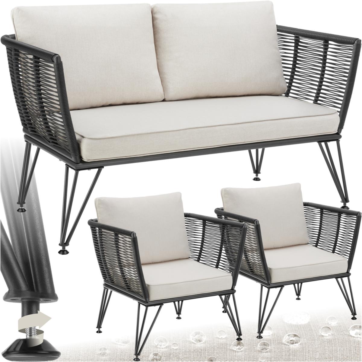 pWith this stylish Sundo garden furniture set from tectake, you can bring an inviting and cosy atmosphere to your balcony or garden. The 4 seater set consists of a sofa and two armchairs and offers enough space to relax with friends and family. Whether for relaxing afternoons alone on a comfortable chair or sociable evenings lounged on the sofa with friends, this metal and rattan ensemble is the perfect addition to your outdoor space.pp. The garden lounge set combines an elegant, natural-looking weave of weather-resistant polyrattan with a robust, powder-coated steel frame. These high-quality materials ensure the sofa and chairs are stable and durable, and stand the test of time. The sets height-adjustable feet ensure great stability, even on uneven surfaces. The thick seat cushions and soft back cushions offer you and your guests a first-class seating experience. The easy-care covers made of durable polyester can be effortlessly removed with a zip and easily cleaned, so your garden lounge set remains in top condition.pp. With its charming, modern look, this seating group of two beautifully shaped armchairs and a spacious sofa fits perfectly into any outdoor area, and can be easily paired with a bistro table for a relaxed dining experience which encourages guests to linger. Enjoy trendy design, durable materials and maximum comfort in your home with the Sundo garden furniture set from tectake.p