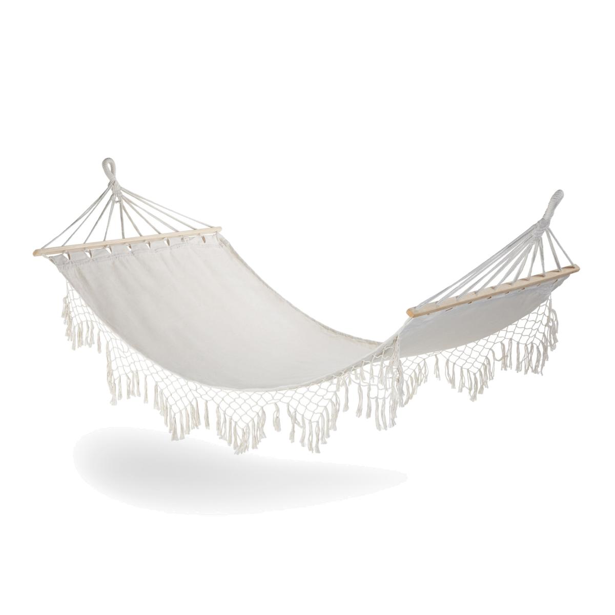 Perfect for solo outdoor relaxation after a long day, the Von Haus hammock is a summer essential for your garden, patio, or terrace. Featuring elegant fringe detailing, welcome warmer days in chic style. The soft poly cotton blend offers unrivalled comfort, whilst adding a boho touch to your garden. Single Hammock with Secure Rope Attachments. For Garden, Patio & Terrace. Featuring a generous 110kg max weight capacity and finished with strong wooden spreader bars for even distribution, relax in comfortable confidence with this garden hammock. Use the thickened rope attachments to secure your portable hammock to a pair of sturdy supports, we recommend attaching to trees, thick beams, or posts on your veranda. Thanks to the lightweight and versatile design, you can also take your rope hammock with you on your trips to the campsite, park, or even festivals.