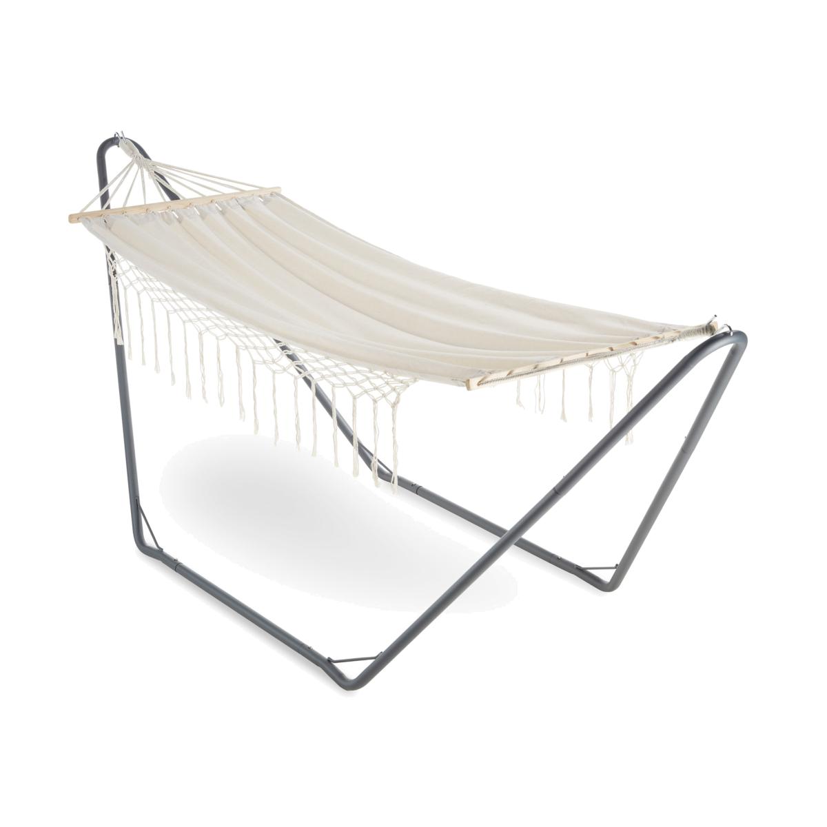 VonHaus 1 Person Hammock. Bohemian Crocheted Fringe Design. Swinging into summer in boho style. Perfect for solo outdoor relaxation after a long day, the Von Haus hammock is a summer essential for any garden, patio, or terrace. Featuring elegant fringe detailing, welcome warmer days in chic style. The soft poly cotton blend offers unrivalled comfort, whilst adding a boho touch to your garden. Looking to upgrade your garden furniture with a touch of novelty? Featuring a generous 110kg max capacity and wooden stabiliser bars for even distribution, relax in comfortable confidence with this free standing hammock. Use the robust rope attachments to secure your single hammock to the powder coated steel frame, before sinking back into your cosy cocoon and swaying the days away. No sun? No problem, store the lightweight hammock and stand indoors whilst you wait for better weather to return!