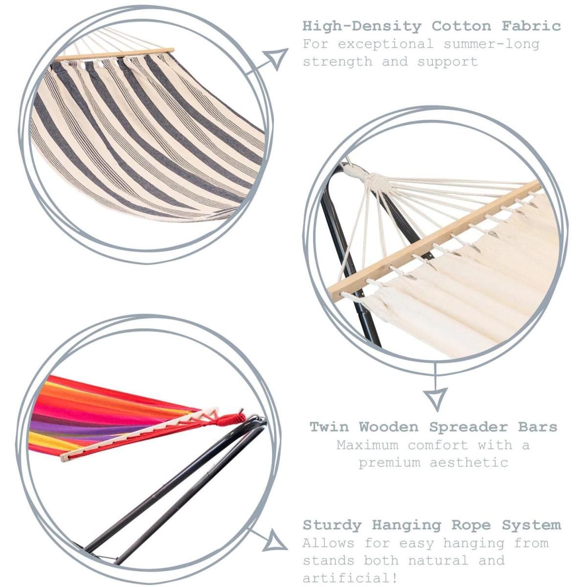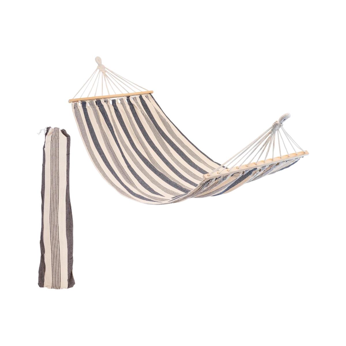 The Harbour Housewares collection of Garden Hammocks gives you a stylish and comfortable place to while away the hours on those glorious hot summer days. A staple of Central and South American sleeping habits for centuries, the hammock has grown to become a true symbol of relaxation and carefree living. These hammocks have been crafted in the Brazilian style, using heavyweight cotton for the ultimate in softness and comfort. Each end has been finished with a wooden spreader bar that keeps the fabric taut and open - perfect for sun worshippers!Two robust hanging loops allow you to hang your hammock from any suitably sturdy tree or similar garden feature. Alternatively, pair with our Metal Hammock Stand for maximum freedom and flexibility!