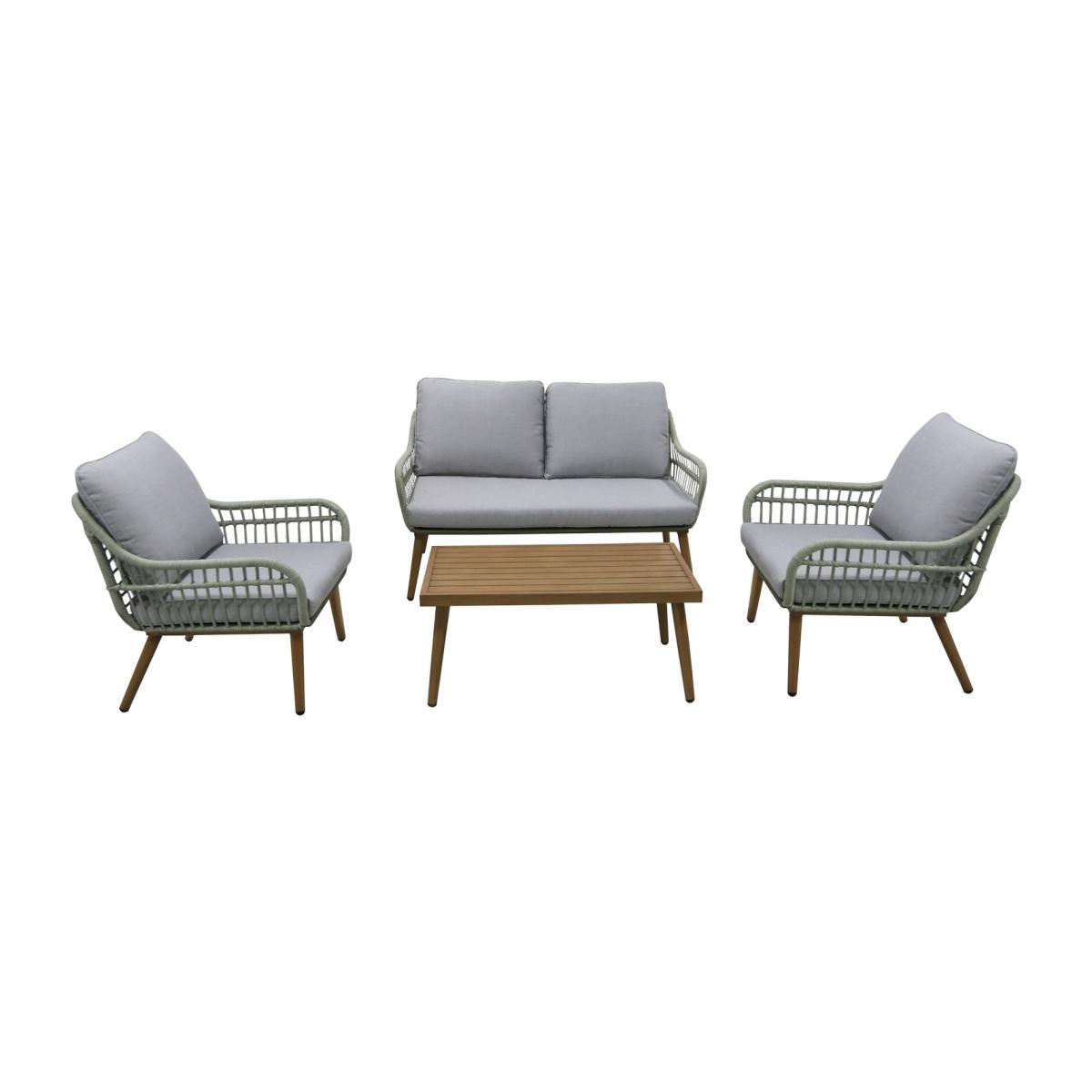 Relax and soak up the sun with this easy-care, 4 Seater Aluminium Lounge Set. The set is made from high quality powder-coated aluminium, making it durable, lightweight, resistant to rust and weatherproof. The aluminium frame is powder coated and finished with sage-green rope detailing. Comfort is assured with soft, 8cm thick seat and back cushions in a practical light grey. The chairs are complemented by an aluminium coffee table with wood effect finish. Store under cover in extreme weather conditions.