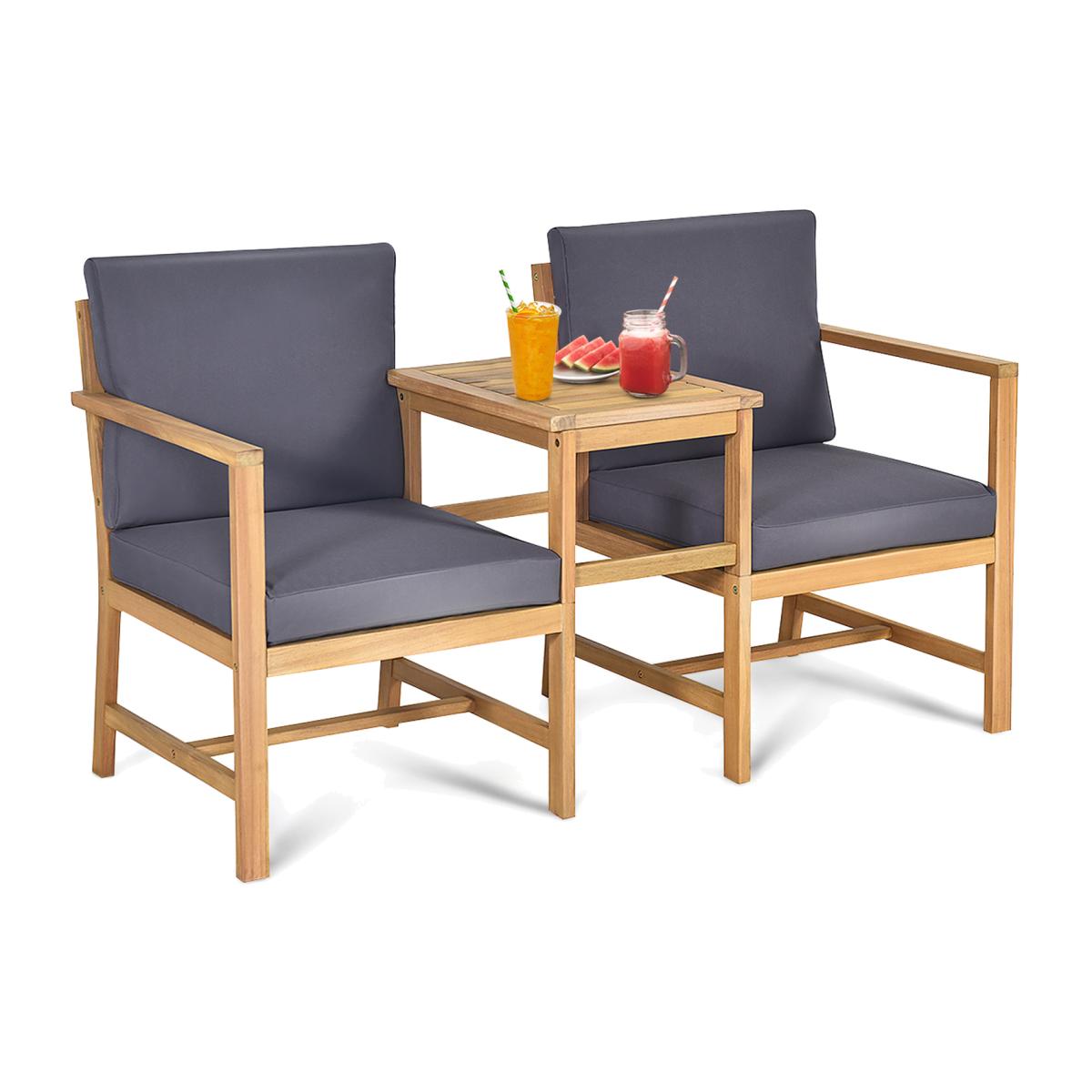 Look at this wooden companion set made of high quality acacia wood! This elaborate bench seats two people and provides you with truly outstanding outdoor seating. With this product you can relax with your loved ones in the summer sunshine. The coffee table can be used independently or stacked between two chairs, making it an ideal place to store drinks, books, magazines and other accessories. At the same time, the outdoor furniture wooden chair table equipped with soft and thick sponge cushions to bring you extra comfort. With complete instructions, you can quickly complete the assembly.