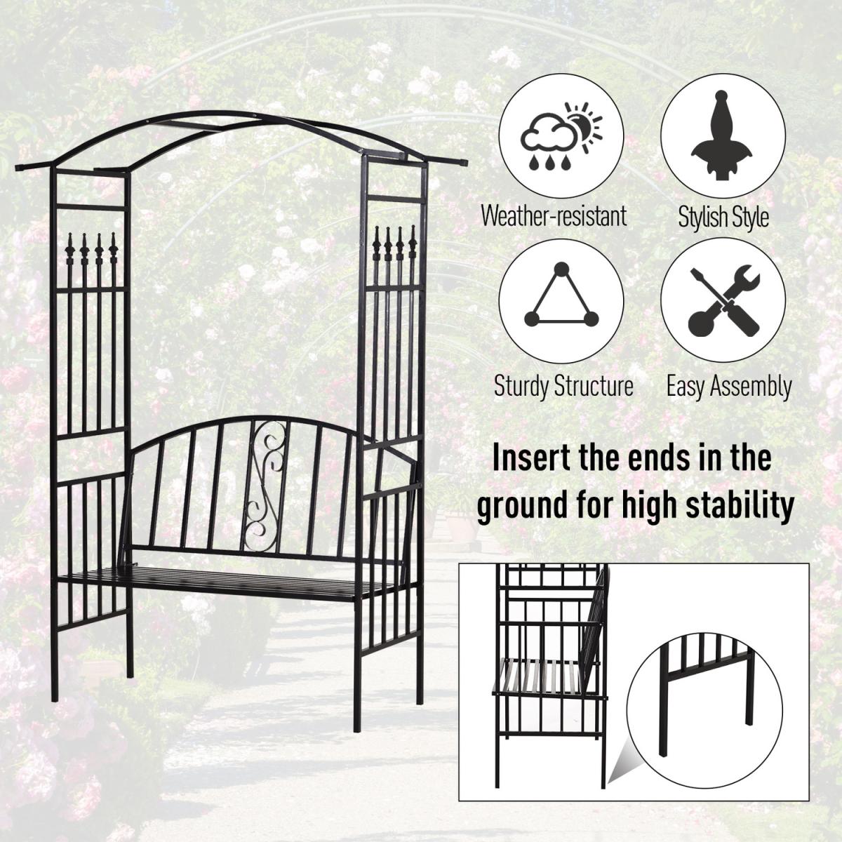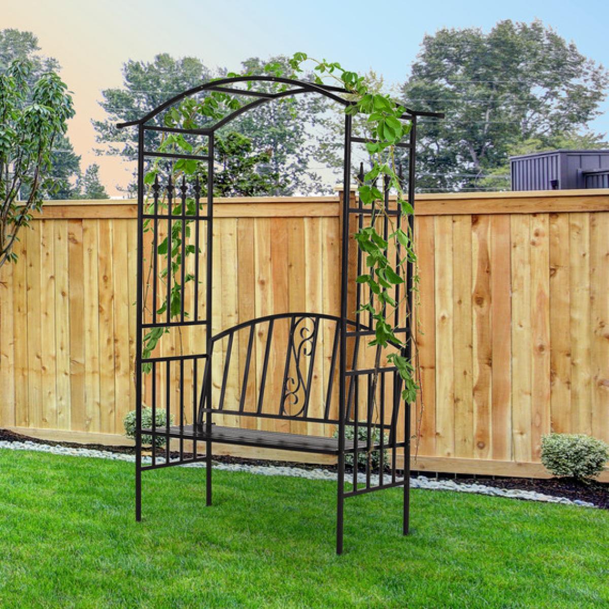 A duo design, it blends together a two-seater bench with a traditional garden bench to give you a piece that is sure to attract all the right attention. Formed from metal with a powder coating, the frame is tough and durable to ensure it lasts in your garden for seasons to come, with bars on the sides and top to allow you to hang baskets from and grow vines around, whilst the scrolling on the back of bench adds extra beauty. Slatted all over to prevent water build-up and damage, as well as allowing air to pass through whilst you are seating on hotter days, the bench is wide and big enough to relax with a friend. A must for anyone who wants to create a unique feel in their outdoor area.