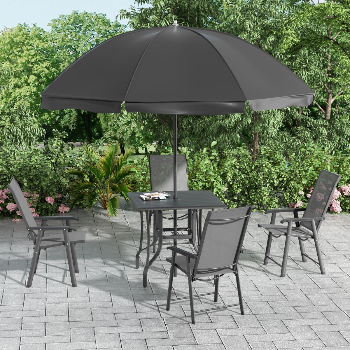 Enjoy outdoor moments with our Metal Slatted Coffee Table and 4-Chair Set. Crafted from durable metal with an anti-corrosion coating, this table resists the elements while keeping a sleek appearance. The built-in parasol hole allows you to add an umbrella for extra sun or wind protection. Paired with four sturdy patio chairs, this set brings both style and comfort to any outdoor space. Garden Metal Slatted Coffee Table with Four Chairs - Dark Grey / 1 Square Table and 4 Foldable Chairs