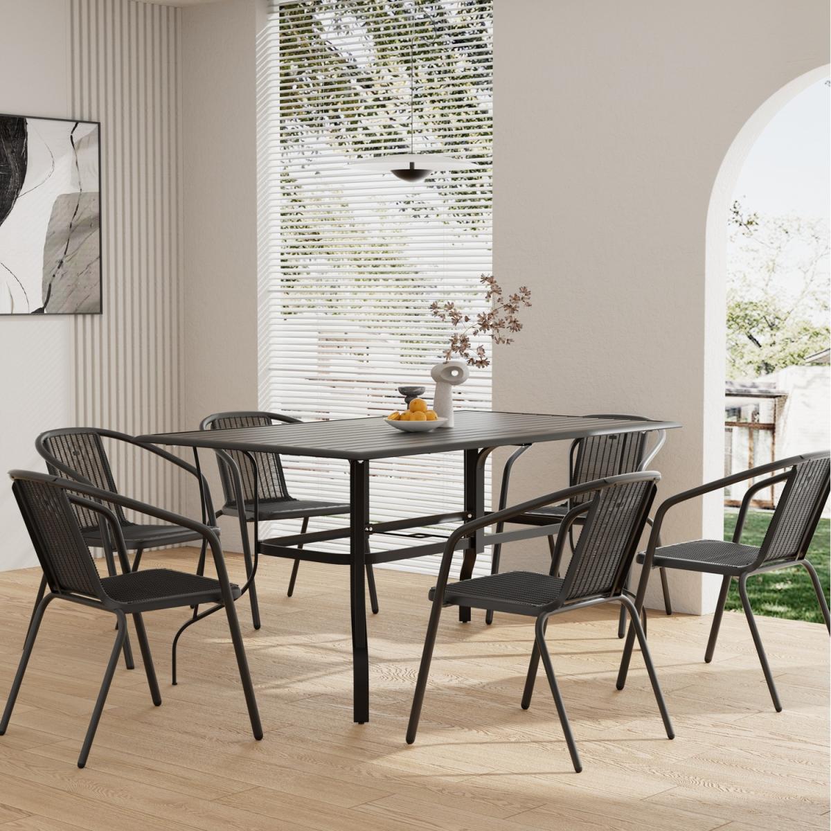 Enjoy your outdoor gatherings with our Table and Chair Set. Crafted from durable metal with an anti-corrosion coating, the sleek table is designed to resist the elements, making it a stylish and long-lasting addition to any patio, garden, or balcony. Its practical slatted top allows for easy cleaning and drainage, while the built-in parasol hole gives you the option to add shade for sunny or breezy days. The set comes with 6 ergonomic rattan chairs, made of weather-resistant PE rattan and supported by a rustproof metal frame, ensuring durability and comfort even in harsh weather conditions. Whether it's a morning coffee or evening chat, this set combines function and elegance, making it perfect for outdoor enjoyment.