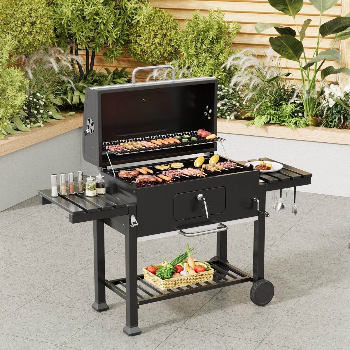 Host the perfect BBQ with our stylish charcoal grill. Its cart-style design offers easy mobility and a sleek look that stands out in any garden. With a spacious grilling area, it's ideal for serving all your guests at once. Garden Mobile Charcoal BBQ Grill with Side Table - Black