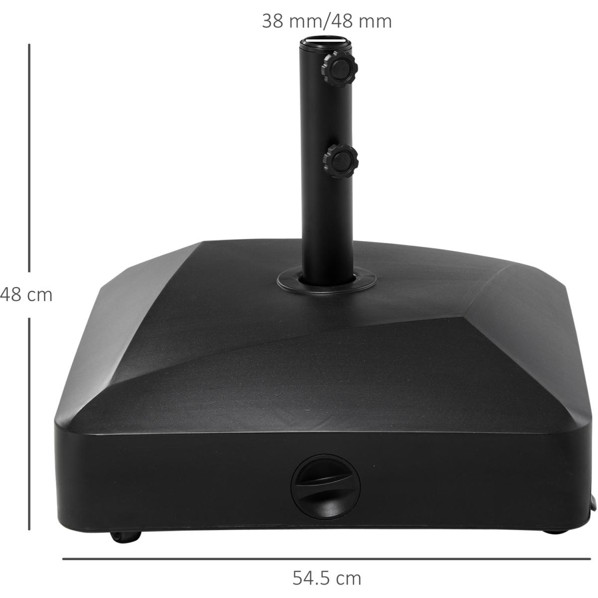 If your parasol is larger than normal style, this garden parasol base from Outsunny ensures your parasol is always held firmly in place with its large capacity - weighs up to 43 kg when filled with water and 60 kg when filled with sand. Features a filling port for easy fill and clean. The double side knobs can fix your umbrella more stably. Furthermore, it comes with wheels and brakes for easy moving. Combine our outside umbrella stand with an umbrella and create your own oasis under the shade.