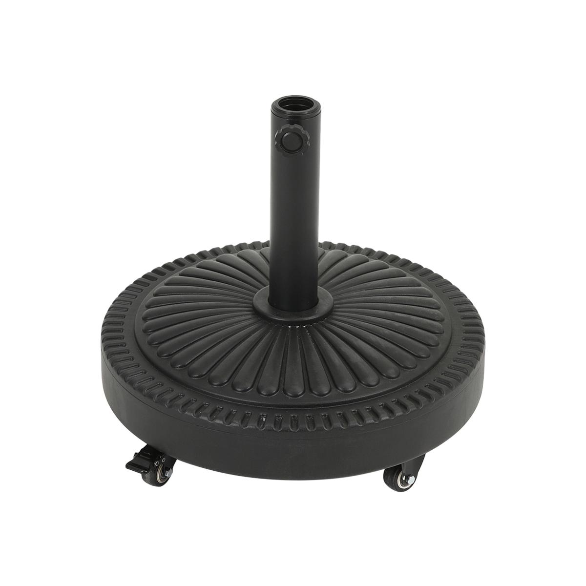Complete your outdoor oasis with the Garden Parasol Stand. Designed to complement your umbrella, this stand is crafted from high-quality materials, including a solid concrete base and a rust-resistant metal pole to endure various climates. In a classic black colour, the base is designed with elegant petal patterns to add a touch of sophistication to your garden. Simply insert your umbrella into the pole by tightening the knob, please note that the base is suitable for 3.84.8CM umbrella poles. Garden Parasol Concrete-Filled Patio Umbrella Stand with Wheels - Black