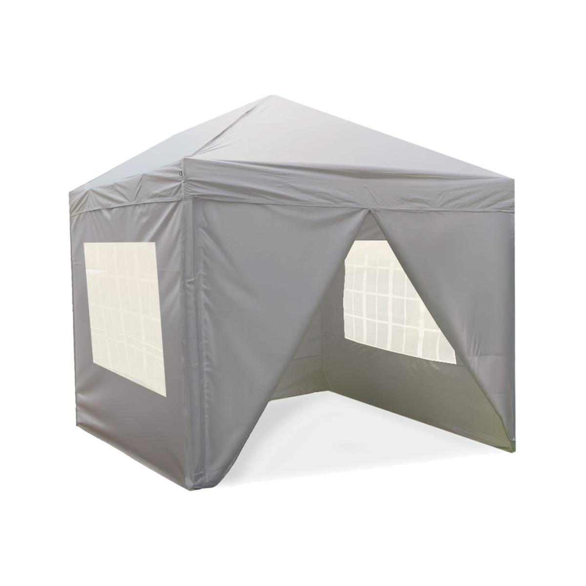 Simple and easy to pop up for family gatherings, parties, events, weddings, or simply to provide some garden shade, this 2.5m x 2.5m gazebo with sides is a must-have summer essential. Manufactured from a durable steel frame and double-layered waterproof canopy, stay protected from the sweltering sun, drizzly showers, or even gusty winds with the included bag weights, ropes, and stakes to help keep your gazebo secure and sturdy. The large square windows let in natural light, providing plenty of brightness for any activities inside the gazebo, and the convenient pop up design saves you time. To set up the gazebo, simple hold each side with a friend and walk the frame outwards until extended, attach the canopy, extend the legs, secure to the ground, and you have a stable and stylish shelter in mere minutes.