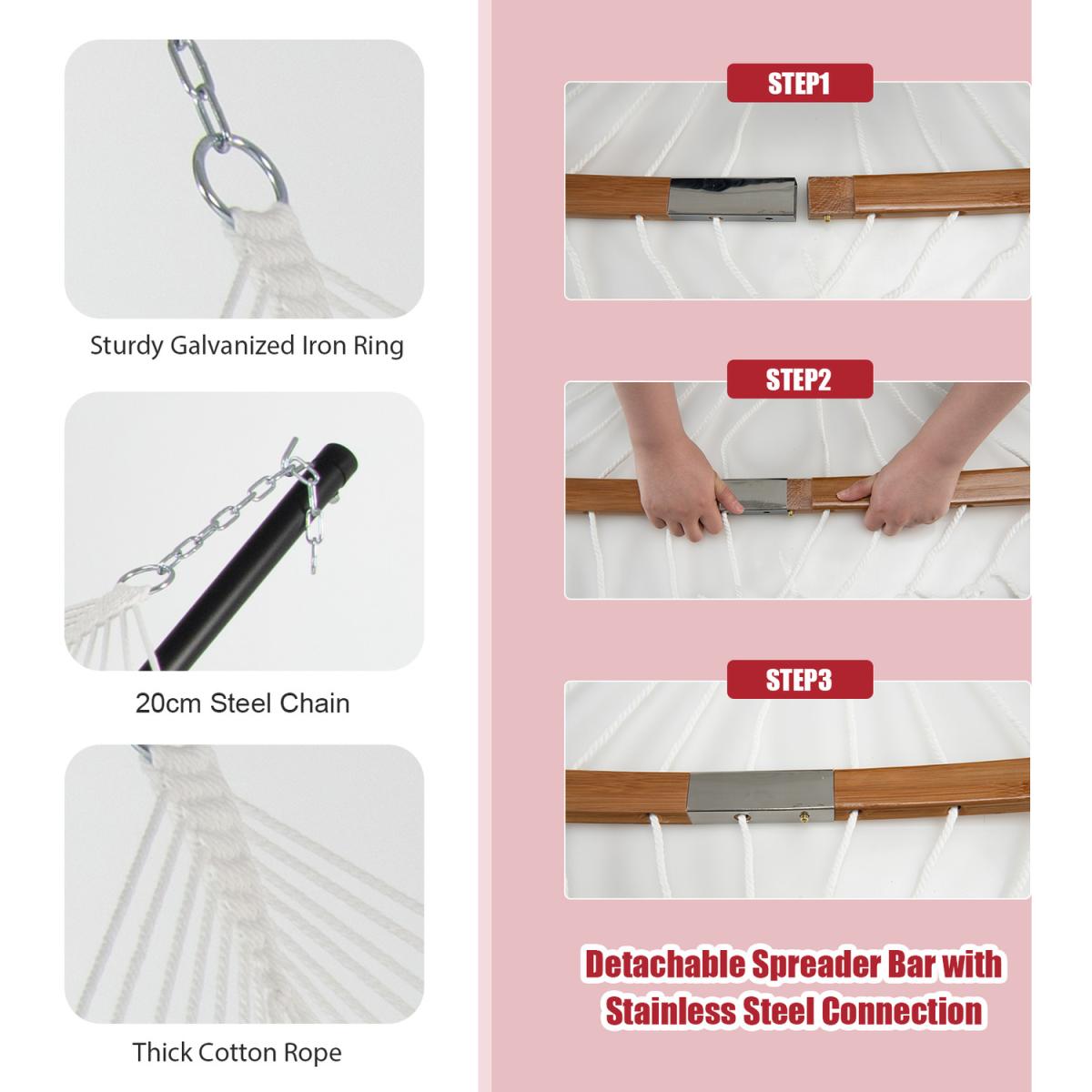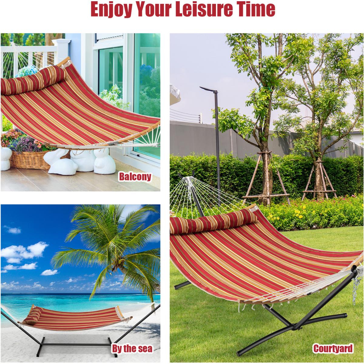 Swing in this hammock to enjoy the leisure, the sun and the breeze!This 2-person hammock is perfect for outdoor use, let you lie in it in your backyard, at the camp, on the beach, etc. Also, the breathable polyester used and the pillow with a soft touch help ease your fatigue and tension of a tiring day. Furthermore, the assembly is quite simple and quick, it is also straightforward to roll it up to conveniently store it when not in use. And thanks to its compact folded size and lightweight, you can carry it anywhere you want.