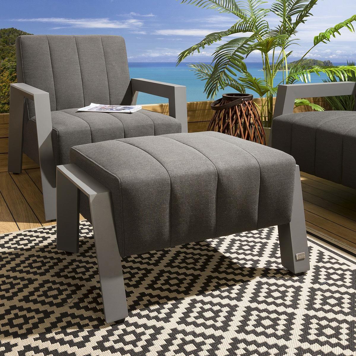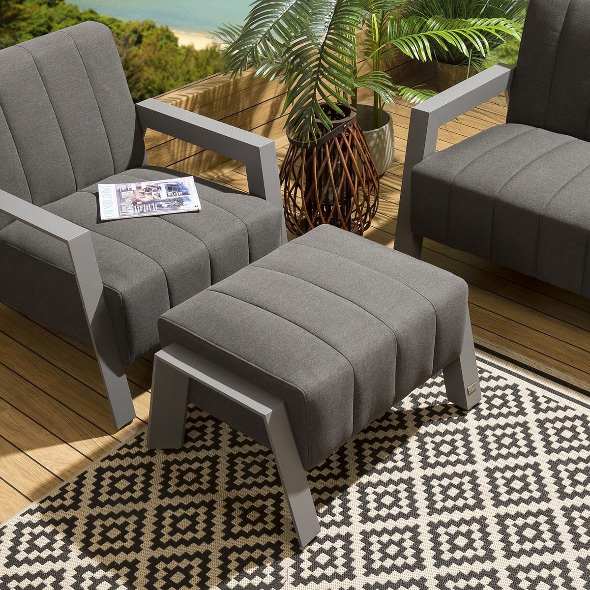 The 1903 outdoor footstool in grey by Quatropi is an essential part of the full 1903 garden sofa set. The footstool is made from high-grade aluminium which makes it very lightweight and easy to change around when the occasion dictates. The weather resistant cushioning is created with high-density foam for long-lasting support which provides ultimate comfort for those long summer dinner parties. The cushion is upholstered in a gorgeous grey outdoor fabric that is manufactured in Spain by Cerdalon who specialise in the most durable marine fabrics - part of the unique designer range of garden patio furniture exclusive to Quatropi. Ongoing maintenance of the footstool is easy, the frame and cushions can easily be cleaned with warm soapy water. Aluminium garden furniture requires very little maintenance, making it the perfect choice for fuss-free dining. You won't need to scrub it or treat it, just an occasional wipe down with warm soapy water and a clean cloth to keep it looking its best. Following the continued success of other Quatropi aluminium patio furniture, we have designed the 1903 outdoor sofa range which combines thick formed aluminium framing with a sofa-inspired, luxuriously thick cushion seat, that together further reduce the weight but maintain the traditional look. Great garden furniture can enhance and complement your garden or balcony, as well as expanding your socialising options beyond the living and dining room. Investing in your outdoor living space can pay great dividends in the spring and summer months, opening up your choices for al fresco dining, garden parties and evening cocktails. A durable garden sofa set from Quatropi will deliver great value-for-money and can last years or even decades. Make the most of your outdoor space with a carefully selected aluminium garden furniture set. Perfect for even the most strenuous weather conditions, all you have to do is keep the cushions dry. Stylish and classic, aluminium has been a steadfast choice for garden furniture and comes in many different styles, paints and stains. Individual made-to-measure covers are included. Welcome in the beautiful spring and summer months with a gorgeous patio sofa set, the quintessential option for elegant dining with a summer evening meal or a cocktail. These chairs offer a relaxing and comfortable option for your back garden or outdoor space. Spread the cost our with interest-free finance options. Minimum spend applies. W78cm D50cm H39cm Modern Garden Furniture Premium Quality Furniture
