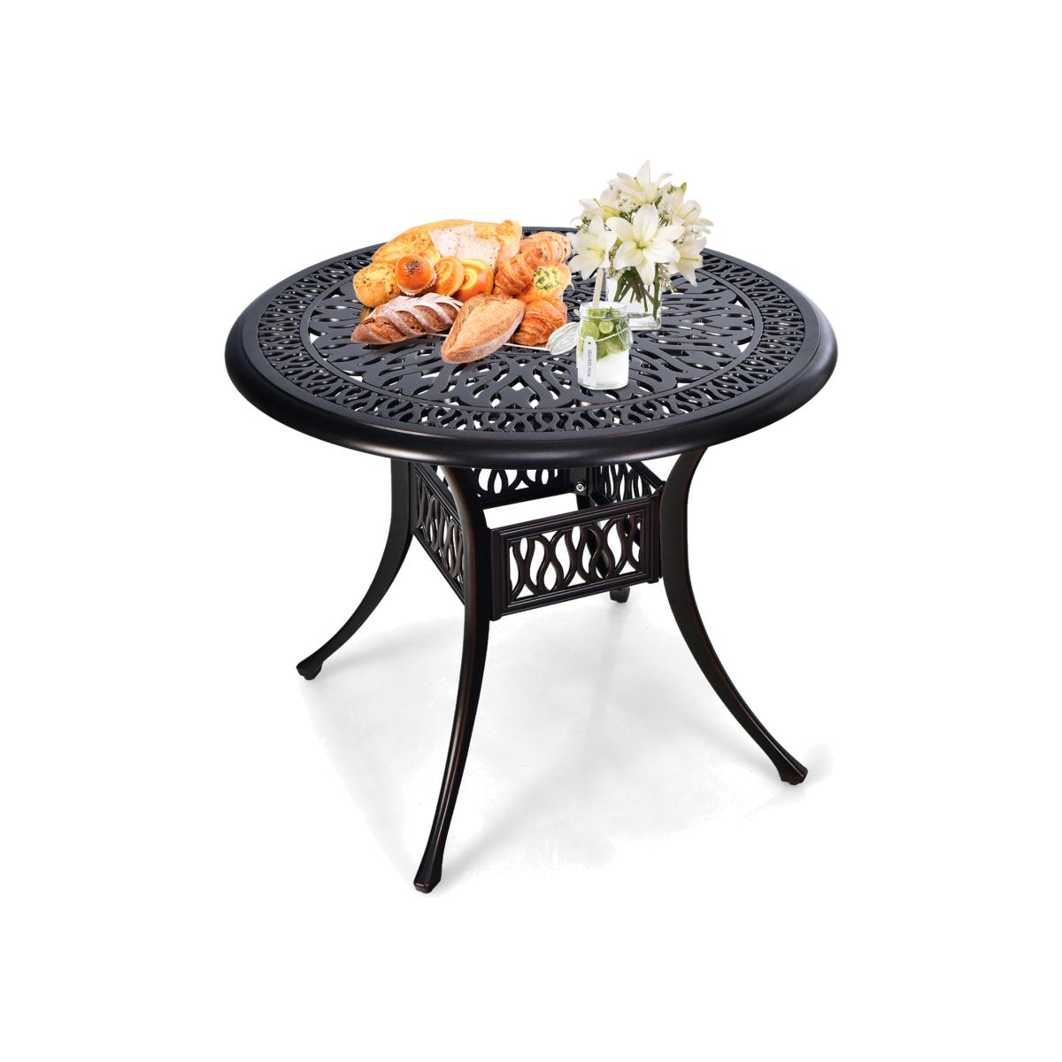 Enjoy a relaxing time with your friends around this outdoor dining table! Made of all-weather cast aluminium, this premium dining table is ideal for the outdoors. The stable structure displays strong load-bearing performance and can well support food, drinks, books or other decorations. In addition, the umbrella hole allows you to install a patio umbrella (not included) to prevent you from being exposed to the sunlight or getting wet in the rain so that you can sit down with your family or friends to relax over a cup of coffee.