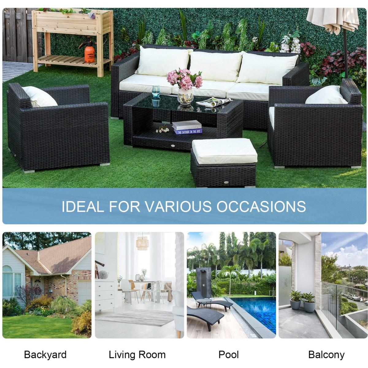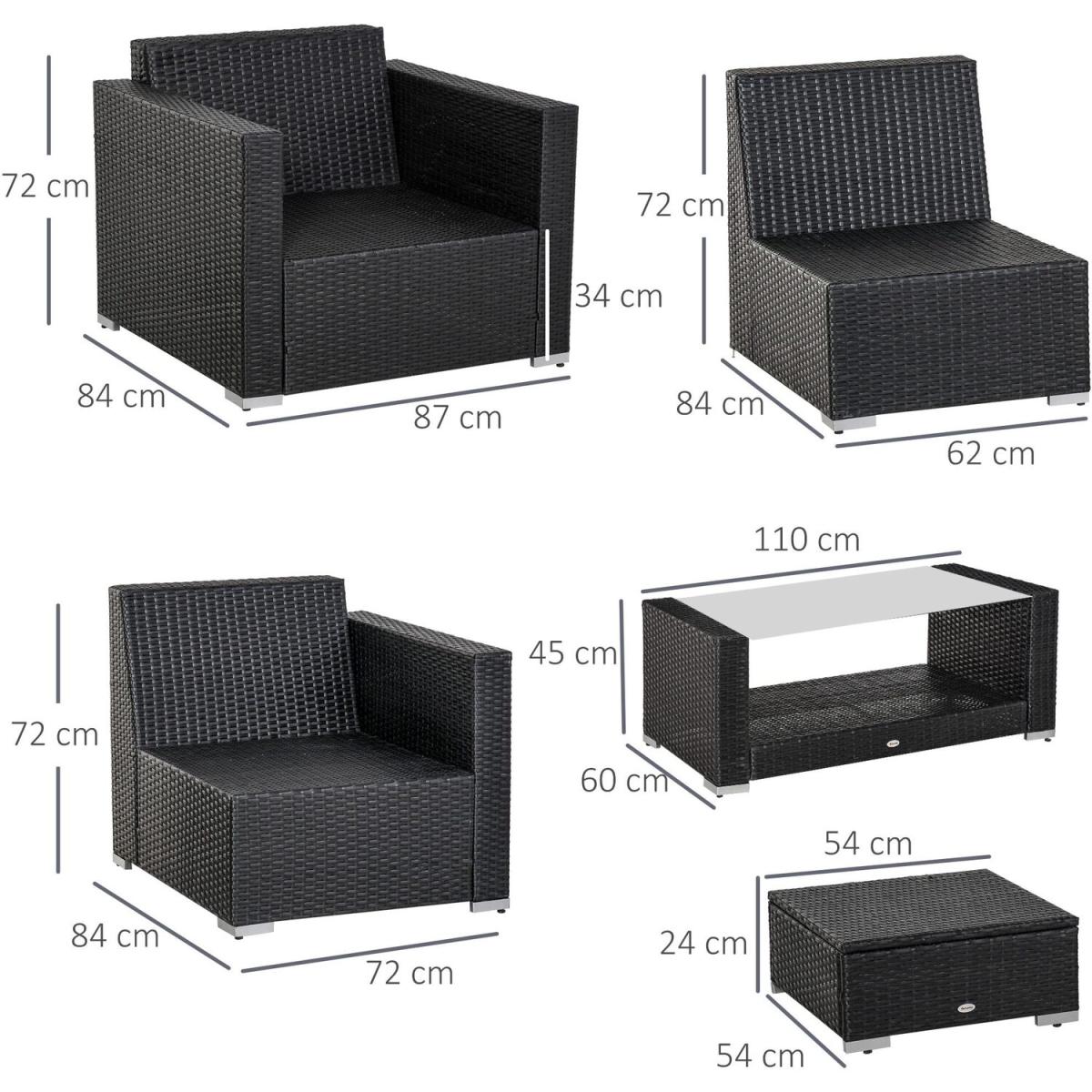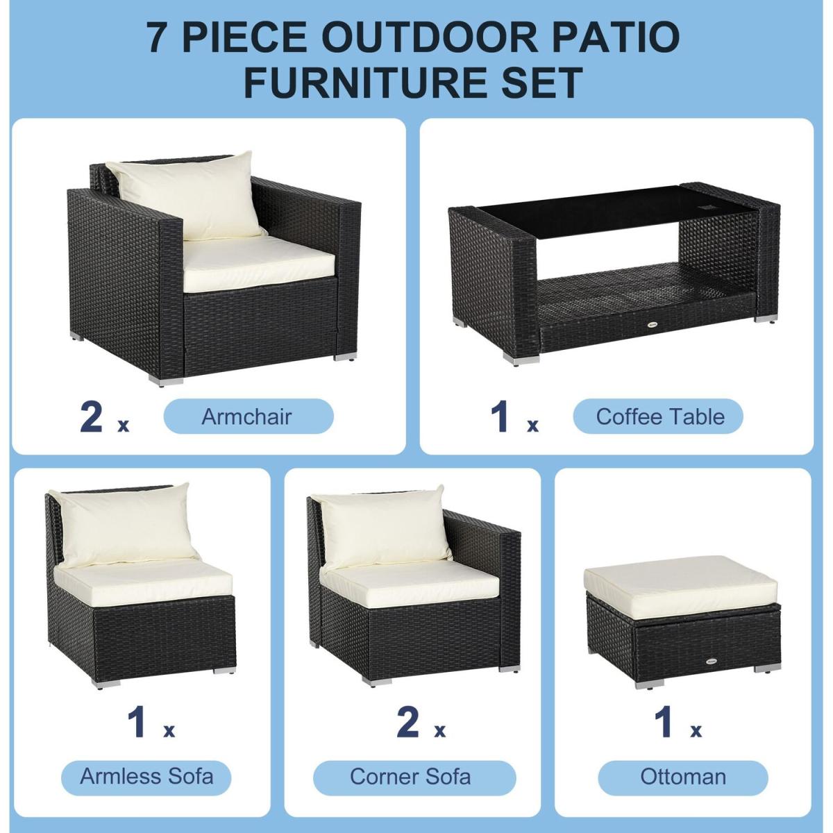 Please Note: We only offer curbside delivery for this item. We cannot deliver this item to your room of choice or to properties above ground level. We do not ship to BT/Guernsey/ Jersey/ the Isle of Man/ Northern Ireland or call for shipping charge. This 7pc Rattan sofa set is made up of 2 single-seater with armrests, 2 corner seats, 1 seater without arms, a table and a footstool. It is made of an aluminium frame and covered with PE rattan. The table is topped with a 5mm transparent tempered glass to place items. And the footstool can be used also as spare seating if required. The set comes complete with cushions and some throw pillows. This is a great set to have in your garden, patio or conservatory.