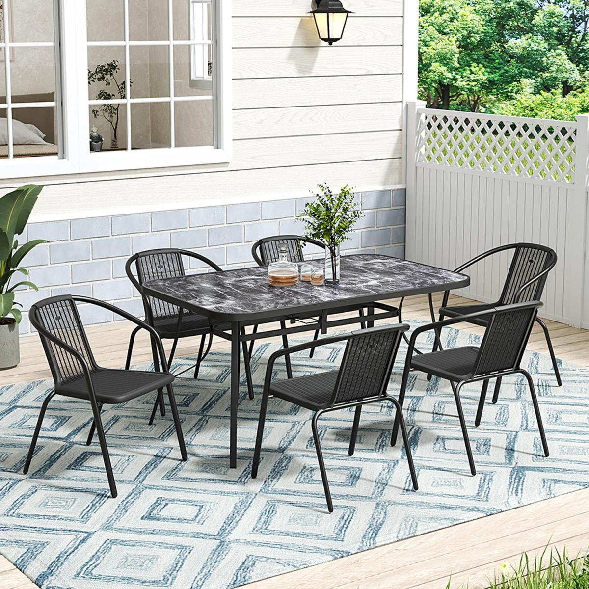 Enjoy outdoor meals and conversations with this dining set. The table features heat-resistant tempered glass with a realistic marble effect, offering a smooth, natural look. Includes 4 rustic-style chairs that complement any garden or patio. Perfect for outdoor spaces like patios, poolsides, and balconies. Garden Rectangular Marble Effect Table with Chairs Set - Black / 1 Table, 6. Chairs