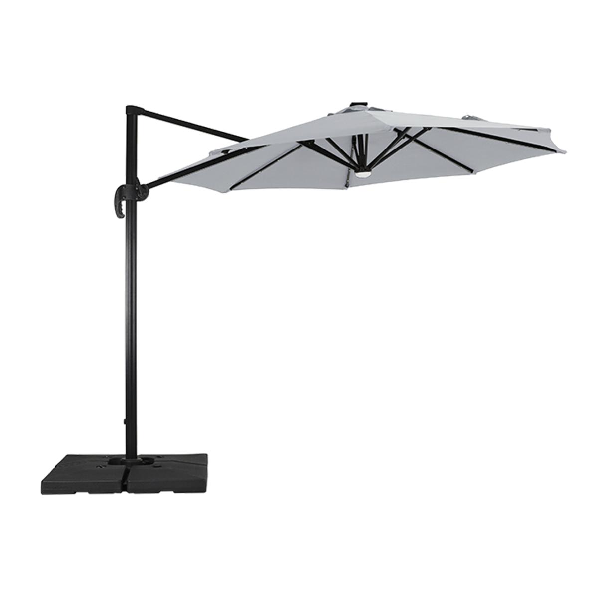 Escape the sun in style with the Garden Cantilever Parasol. Crafted from a durable metal frame, this octagonal parasol is designed to provide shade on hot, sunny days. Its weather-resistant polyester canopy ensures it can withstand all sorts of weather, making it perfect for outdoor use. The convenient crank mechanism and adjustable handle allow you to effortlessly customize the shading angle. With a 360-degree rotating base, you can effortlessly adjust its direction without needing to relocate the entire parasol. Each rib is equipped with solar-powered LED light beads, lighting up your outdoor enjoyment at night.