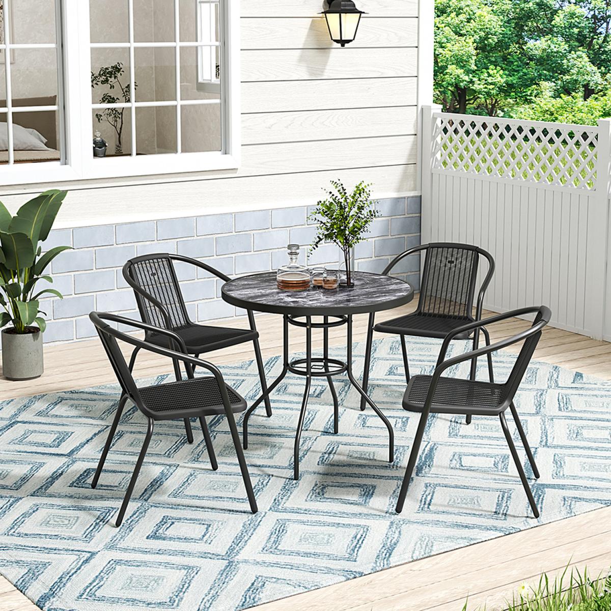 Enjoy outdoor meals and conversations with this dining set. The table features heat-resistant tempered glass with a realistic marble effect, offering a smooth, natural look. Includes 4 rustic-style chairs that complement any garden or patio. Perfect for outdoor spaces like patios, poolsides, and balconies. Garden Round Marble Effect Table with 4 Chairs Set - Black / A Style