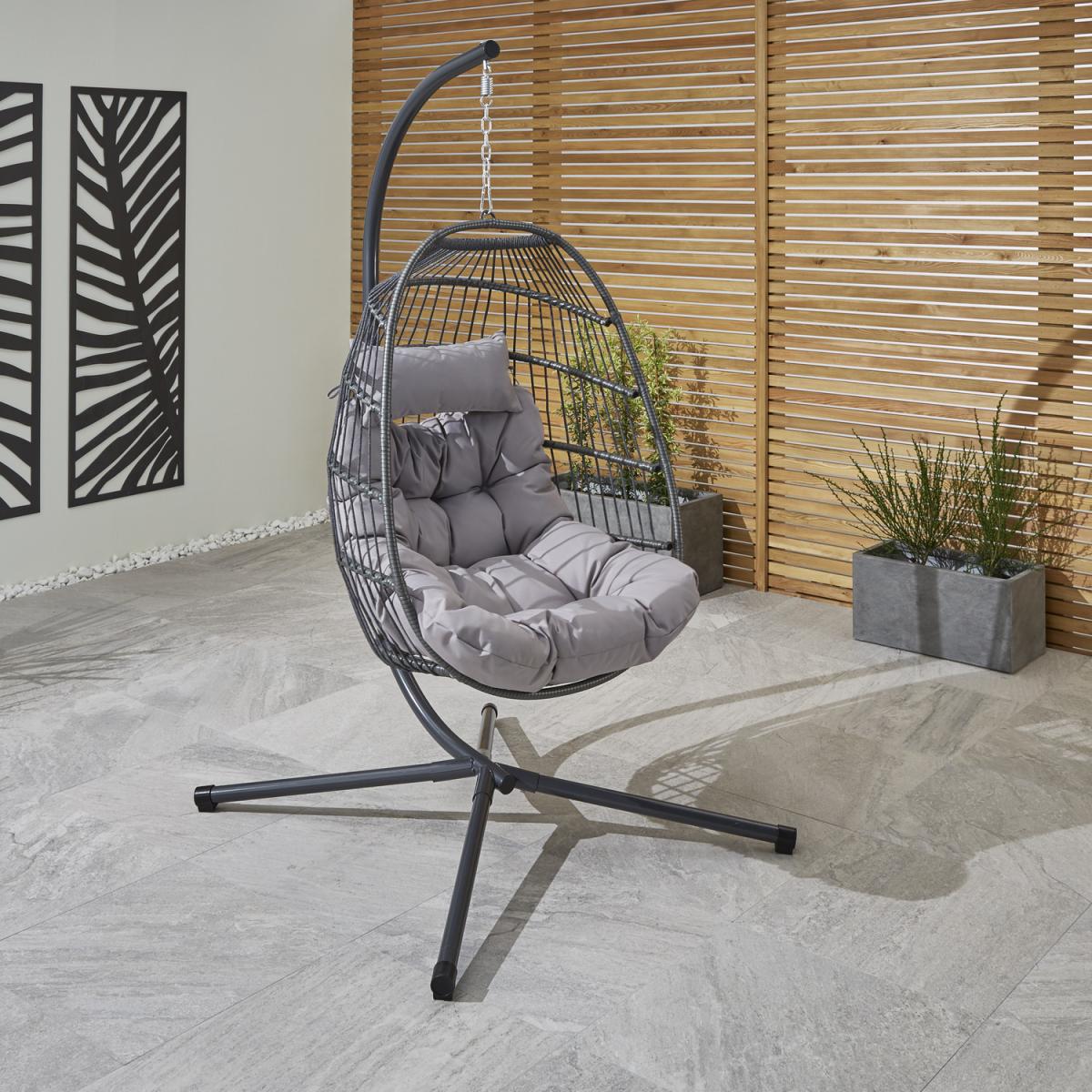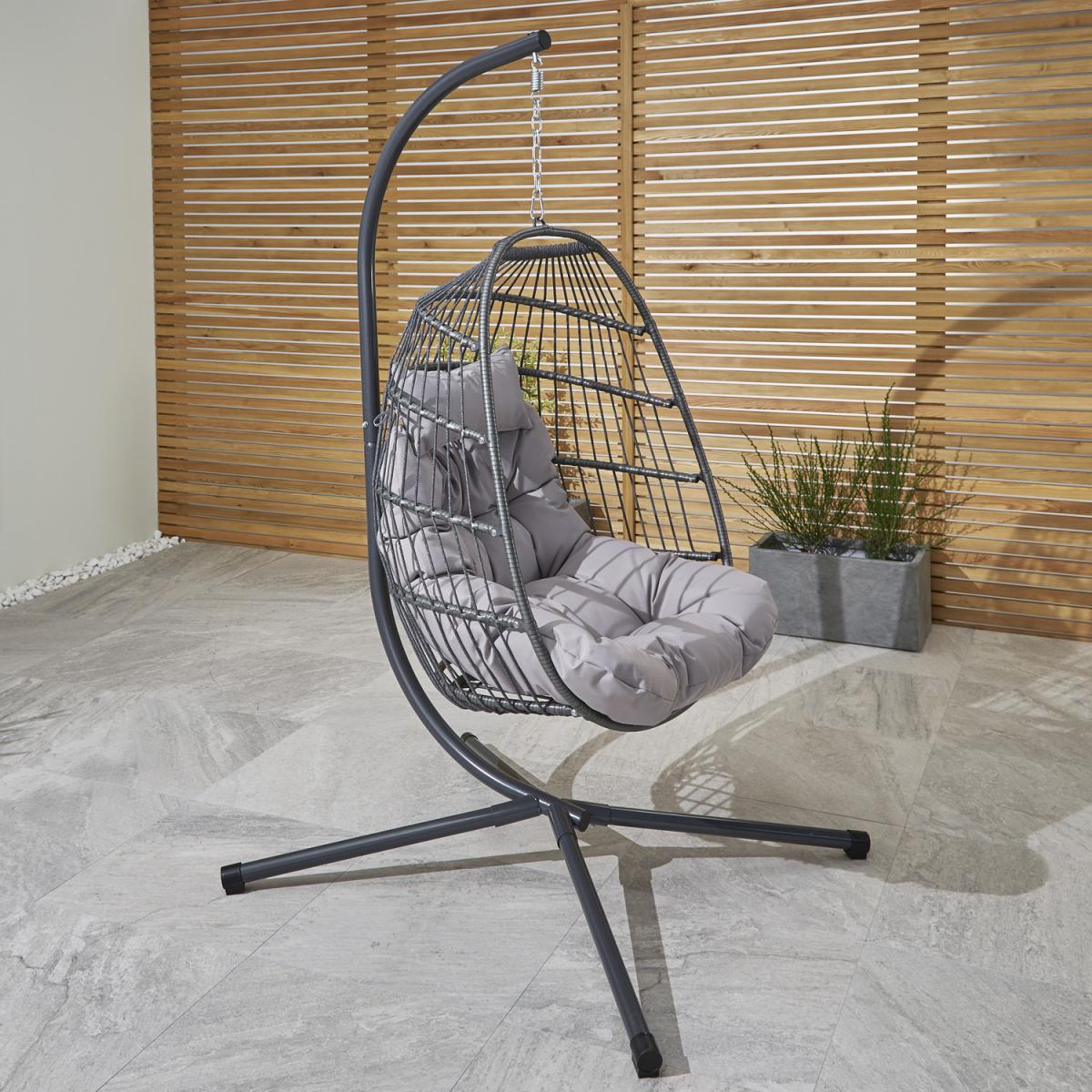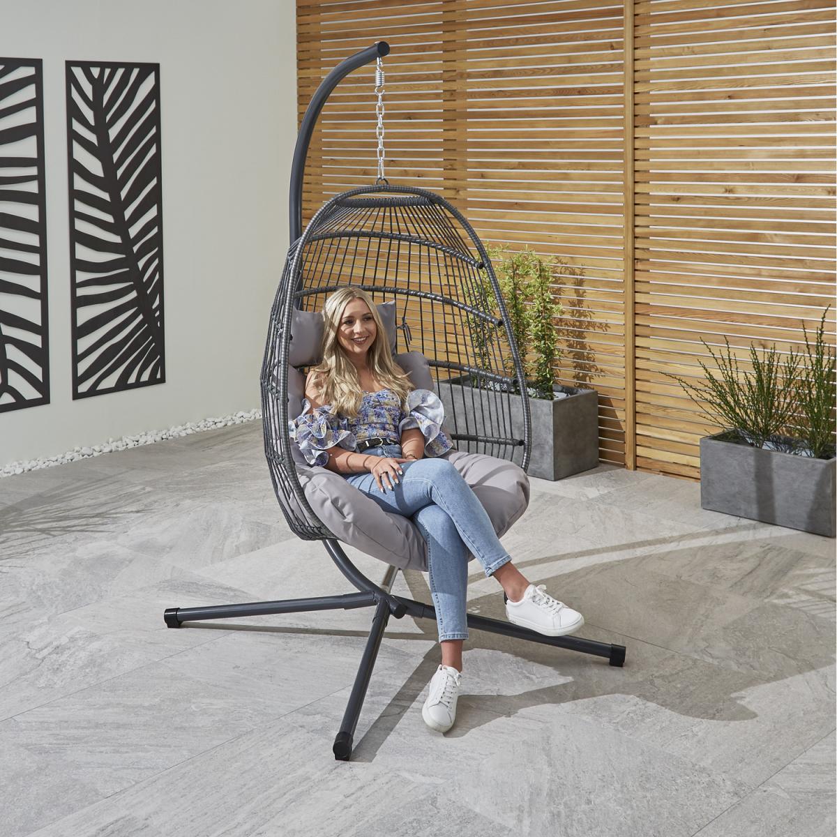 The Bradway hanging egg chair is a peaceful haven that cradles you in comfort with its soft grey cushions and gentle rocking motion, perfect for reading, napping, or just enjoying some quiet time. Overall size: H201 x W87 x D61cm. Basket: 120 x 87 x 61cm. Cushion dimensions: 120 x 90 x 10cm Pillow dimensions: 50 x 20 x10cm
