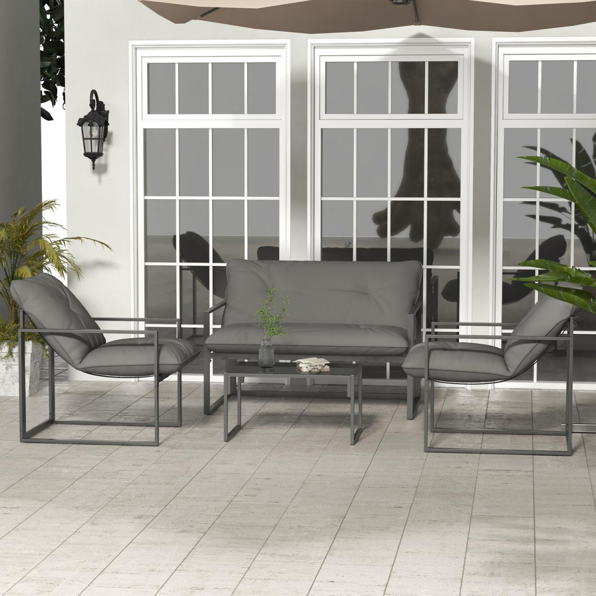 Let friends and family gather around in simple yet sleek style outdoors, thanks to the metal garden furniture sets from Outsunny. The patio set consists of four pieces two armchairs, a two-seater sofa and a dining table with steel frame for a tough and strong structure for longevity, with thick padded cushions on the seats and backs for enduring comfort as you relax. A tempered glass on the long table adds a beautiful finish, with protective pads on each foot for balance. Outsunny Garden Sofa Set with Armchairs Loveseat and Coffee Table - Grey