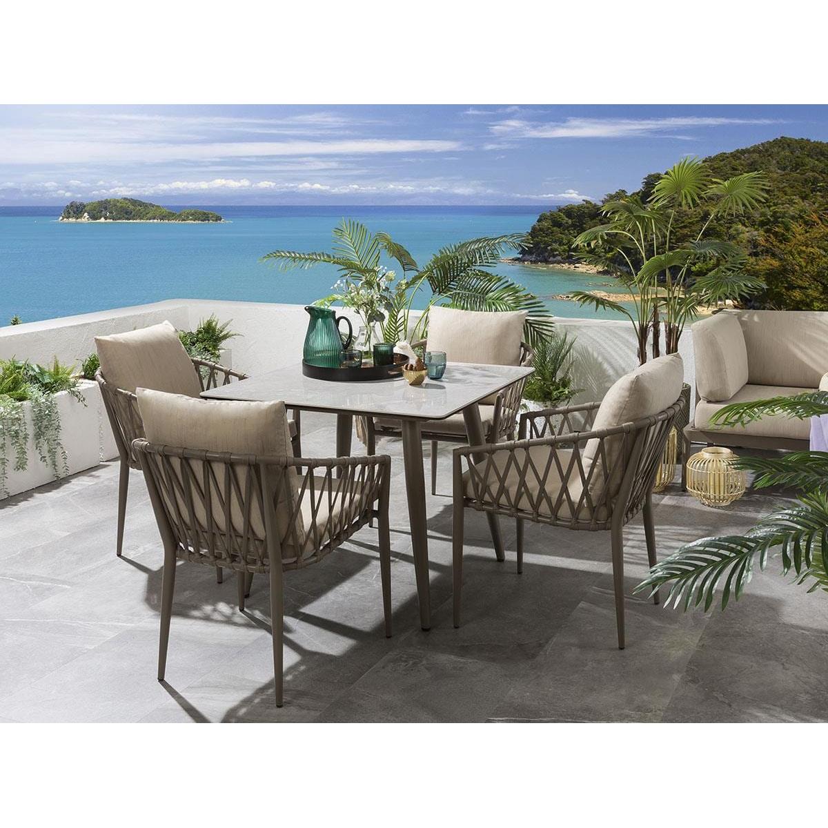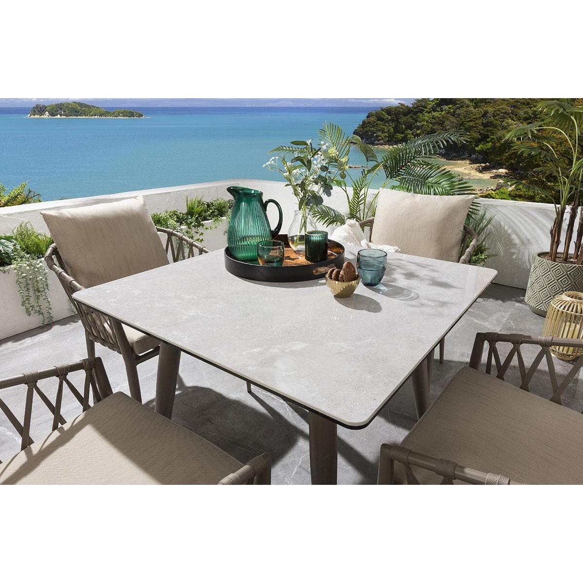 Our hard-wearing and spacious ceramic 90cm square garden dining table makes a perfect addition to any contemporary, modern or minimalist outdoors, providing enough space for up to four people to enjoy dining in comfort. Made from robust and ultra-durable ceramic in a natural smooth light grey marble-effect finish, atop a hard-wearing beige aluminium metal frame - which are set to last for years to come. Expertly crafted aluminium frames are highly durable, complemented by clean lines that lend contemporary style. It is robust and weather-resistant for outdoor use & aluminium frames will not rust and are lightweight to move around. If you need more information about this product, use the Live Chat service to speak to the team or send us a message. Spread the cost our with interest-free finance options. Minimum spend applies.