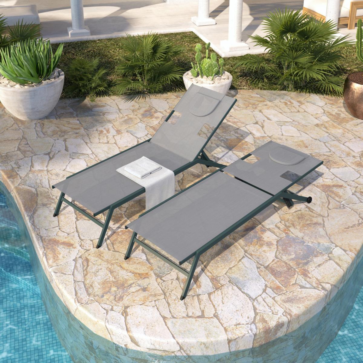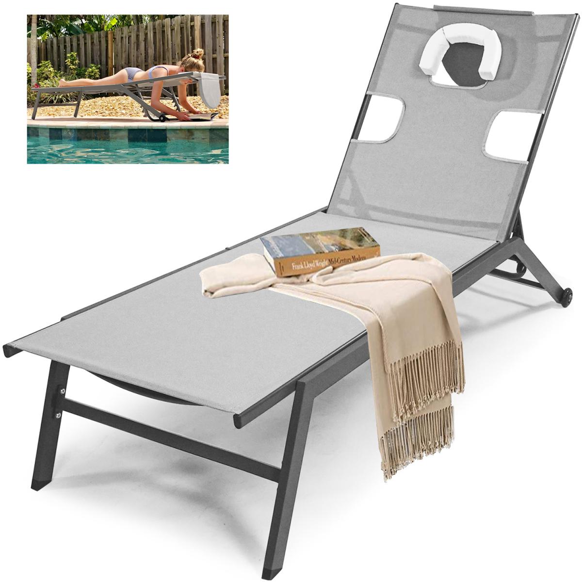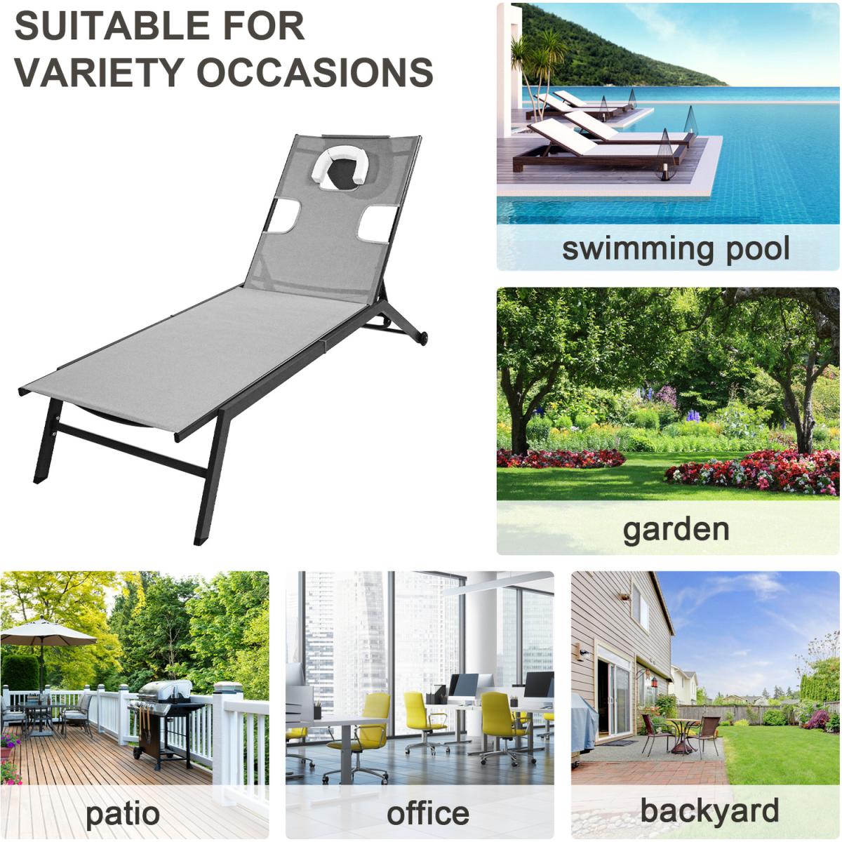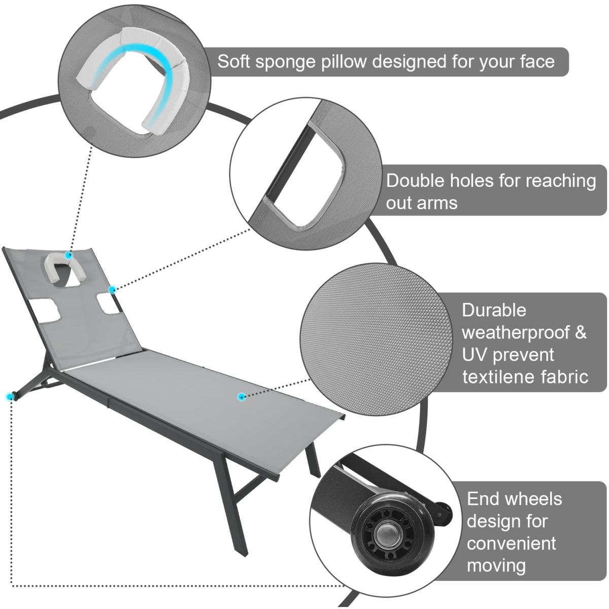 This adjustable chaise lounge with a reading hole and arm slot on the backrest, your face can fit comfortably into the hole, and you can play cell phone or read something while sunbathing on the back, This chaise lounge with 2 wheels. which helps you easily move your chaise lounges easily and labour-efficiently to your lawn, patio or deck. The backrest of a folding sunbed is a 4-level adjustable pattern in angle (134, 148, 163, 180 Degrees) that can meet your different needs to make sure comfortable resting.