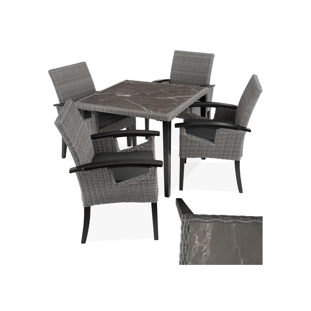 Greet the day with a delicious breakfast or unwind in the evening with a refreshing drink at this stylish garden table and chairs set from Tectake. The outdoor dining set's interesting combination of wood frame, plastic rattan weave, wooden elements and solid porcelain stoneware table top is a real eye-catcher. The materials used for the furniture help with stability, resilience as well as weather resistance, but also mean the set doesn't look out of place within your home, as a kitchen dining set. Of course, comfort is a top priority with this high-quality ensemble - the comfortable upholstery, curved armrests and comfortable backrest make the five-piece garden table and chairs set a dreamlike chill-out zone.